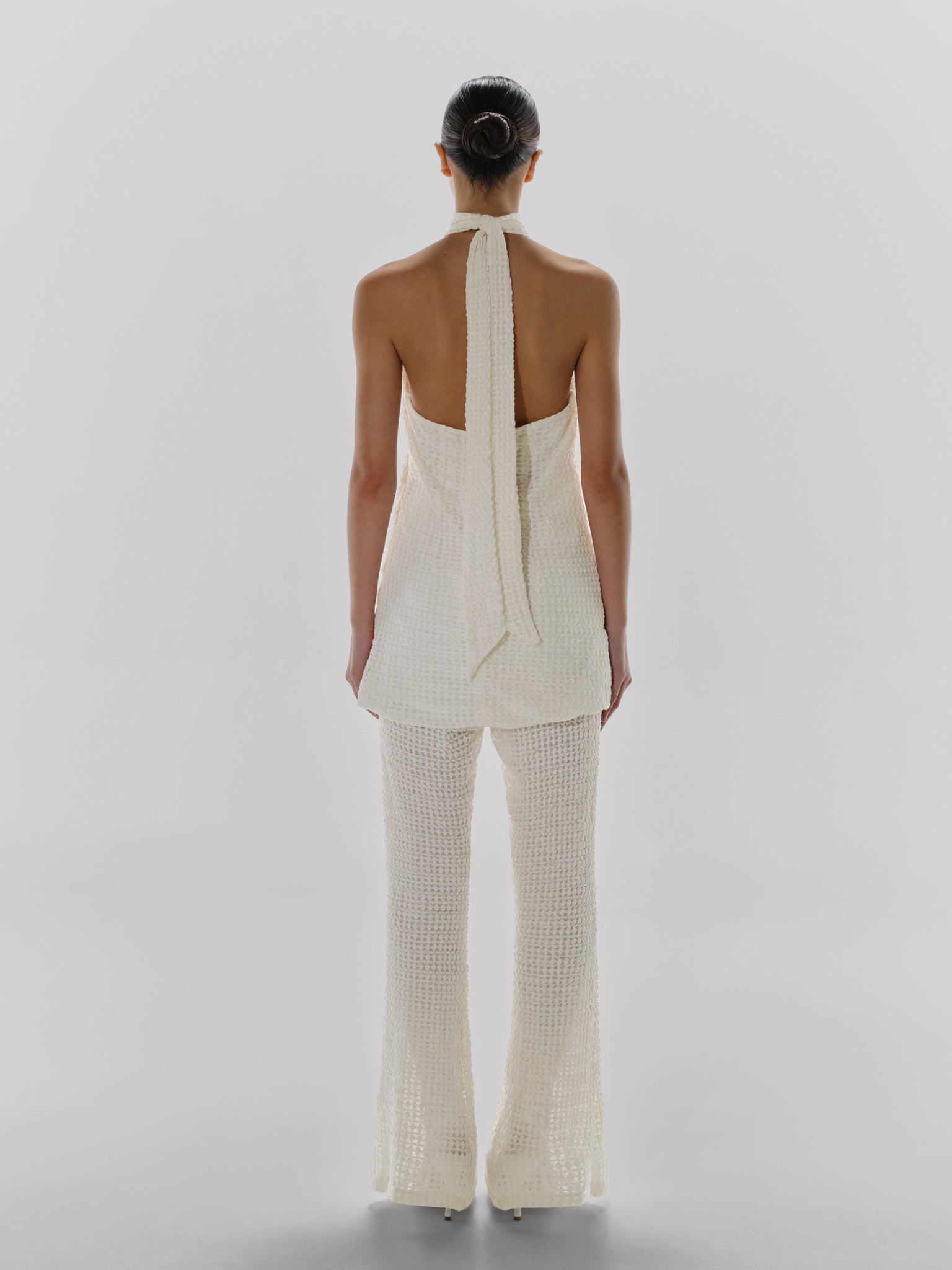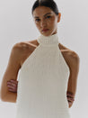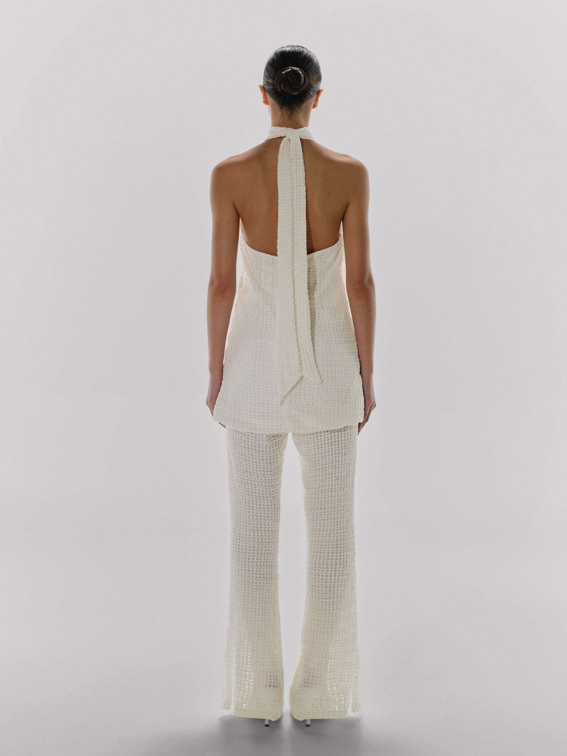 Introducing the "Robin Top" in Ecru – a halter neckline top featuring an open back, shaping darts on the front and back, and a back zipper closure. Crafted in bubble fabric and fully lined. Can also be styled as a mini dress.