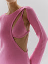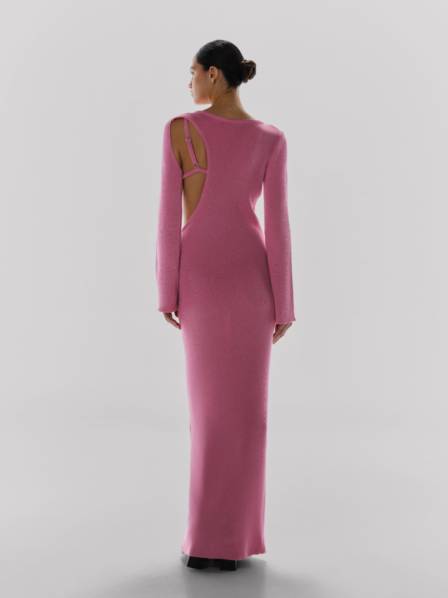 Introducing the "Ruby Maxi Dress" in Guava – a maxi dress with a round neckline and side cutout detail. Designed in knitted fabric with flared cuffs for added movement. Includes a matching top for versatile styling. Unlined for a lightweight feel.