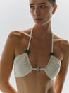 Introducing the "Kei Bikini Top" in Ivory – a bikini top with a U-neckline, ruched detailing, and embellishments. Designed with side boning for support, it features a fully lined construction for comfort and structure.