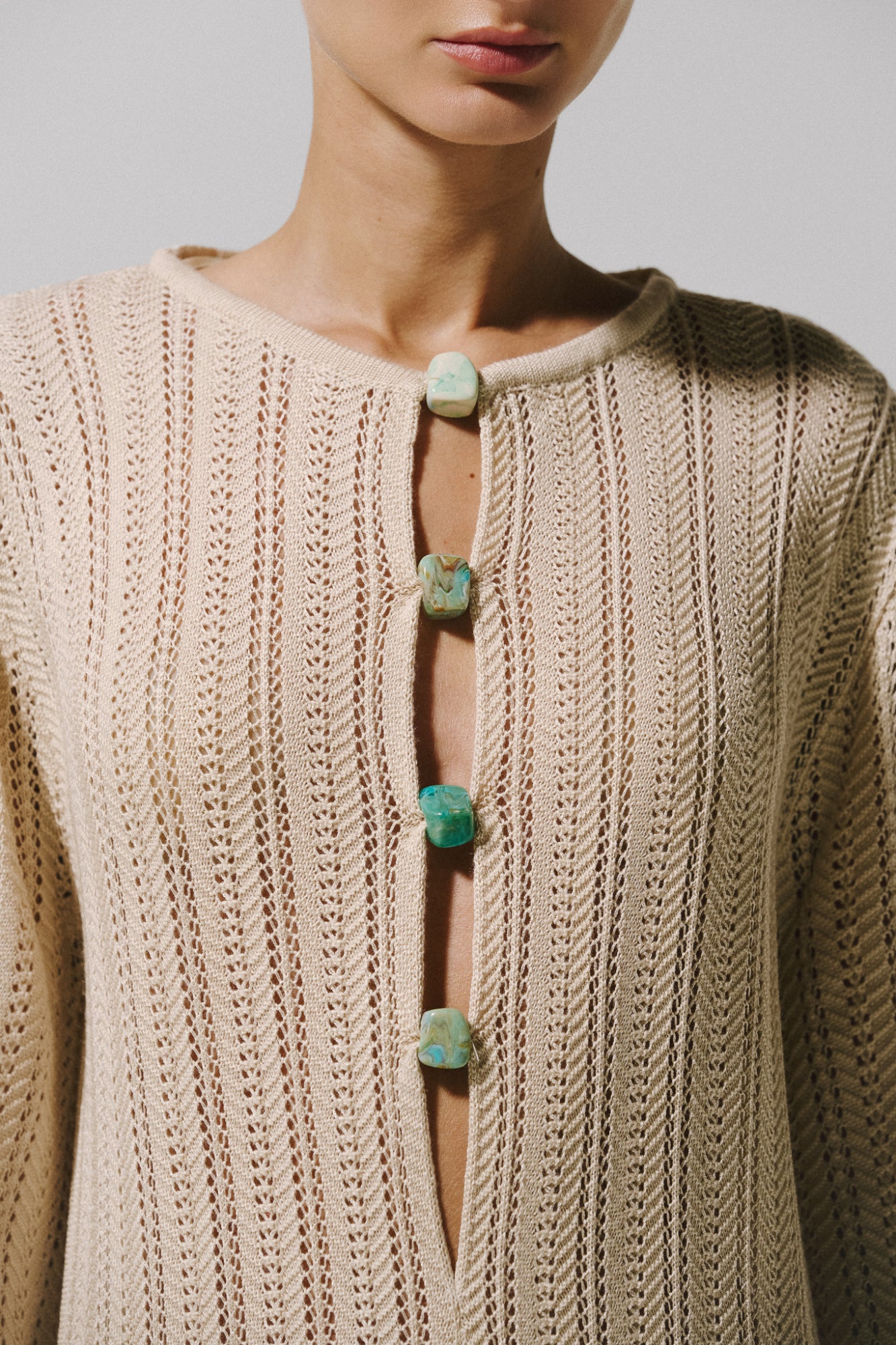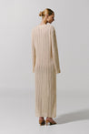 Introducing the "Mamu Maxi Dress" in Ivory – a round neckline silhouette featuring front cutouts and refined embellishments. Crafted in sheer knitted fabric, unlined for lightness, and completed with a front slit for ease of movement.