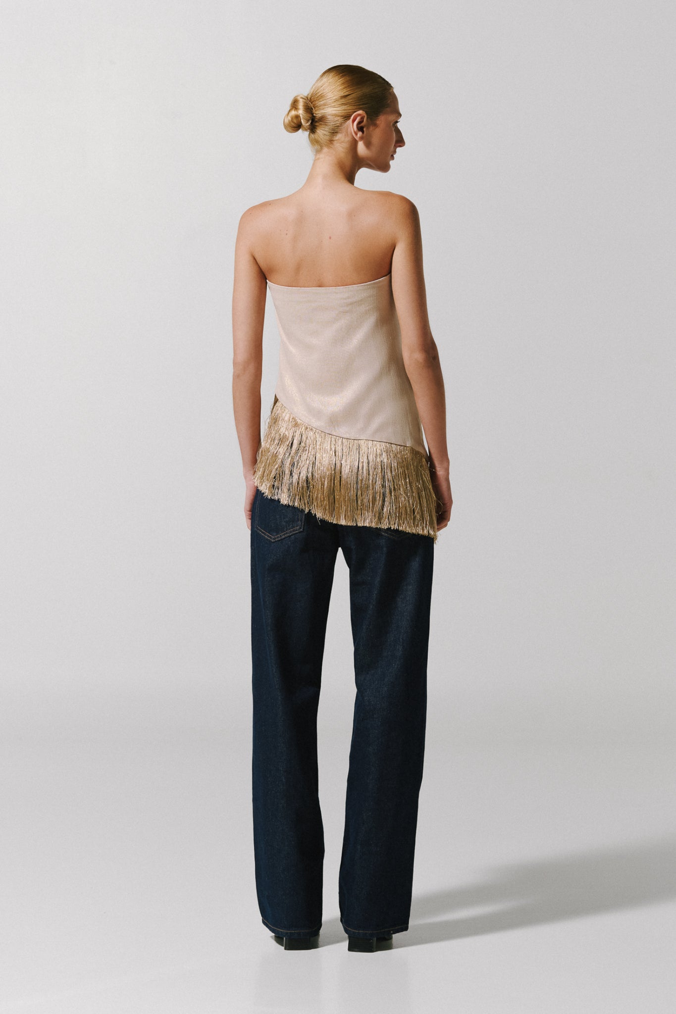 introduciendo el "Top Nella" en Champagne – este top sin tirantes presenta un corte asimétrico, detalles de flecos y acentos brillantes para un look audaz y moderno. Forrado para mayor comodidad con un elegante cierre de cremallera, es una pieza impactante que aporta sofisticación y estilo a cualquier ocasión chic o conjunto de noche.