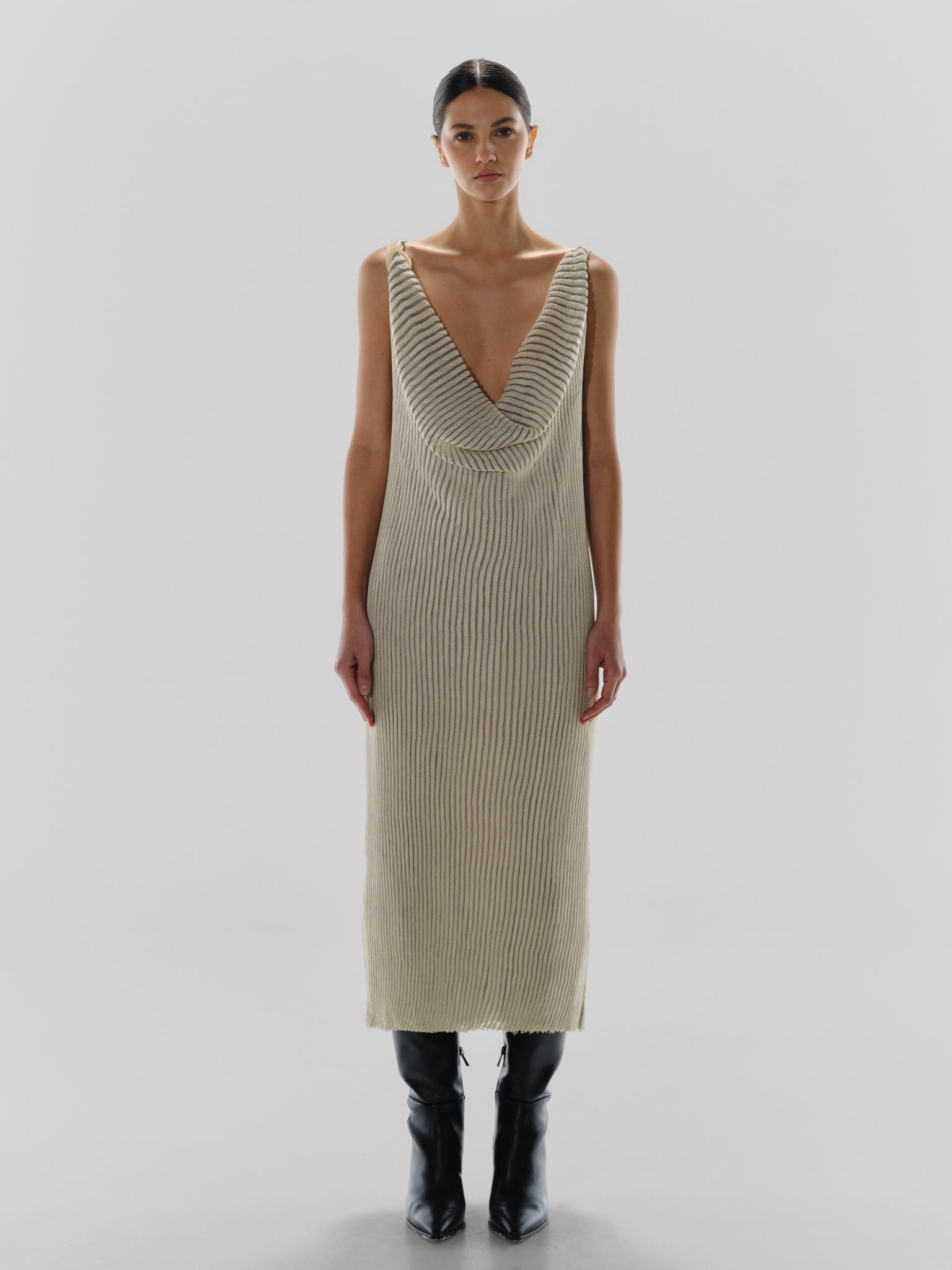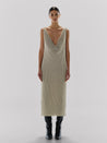 Introducing the "Noche Dress" in Silver Night - a knitted maxi dress elegantly draped at the front, featuring colored details between the knits, providing two shades of white for added dimension. With a low back, this dress offers both comfort and style for any occasion.
