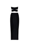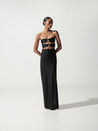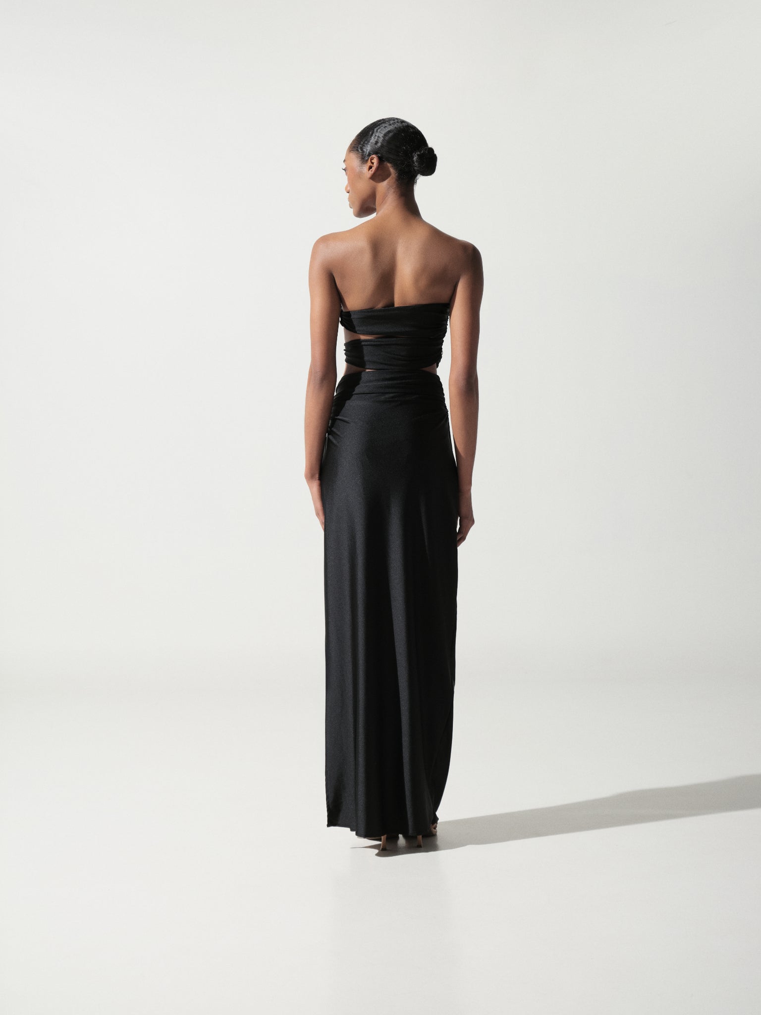 Presentamos el "Isla Maxi Dress" en Black – un diseño de dos piezas con top strapless, herraje Baobab al frente y fruncido que define la silueta. Con recortes frontales y abertura lateral, completamente forrado y de largo maxi.