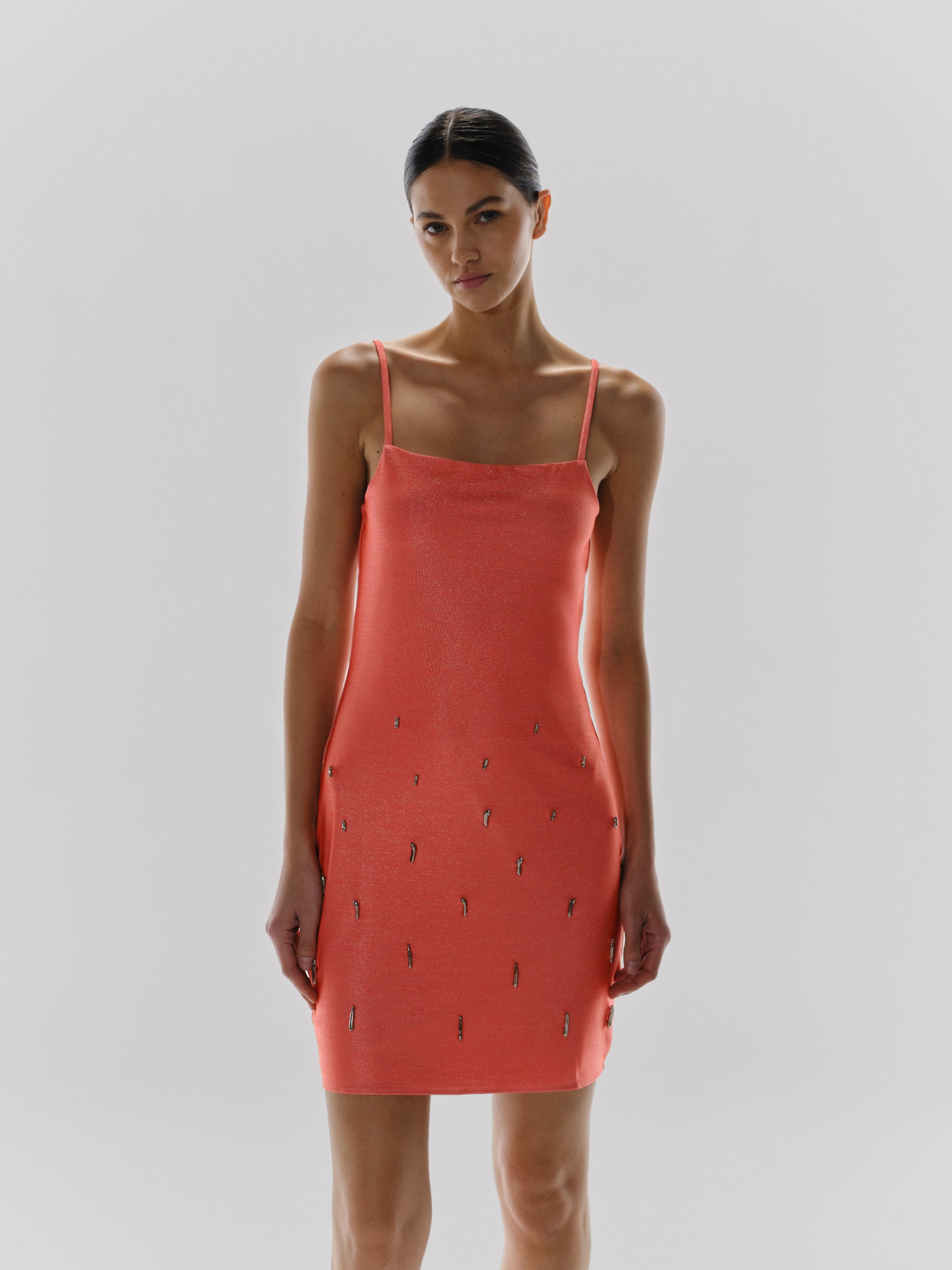 Introduciendo el "Vestido Mini Cale" en Cantaloupe - una impresionante pieza que combina elegancia y estilo. Este vestido mini presenta adornos de pedrería irregular en la parte baja, añadiendo un toque de brillo y singularidad. El escote cuadrado y las tiras delgadas crean un look moderno y favorecedor. La silueta ajustada con cintura definida resalta tu figura. Perfecto para ocasiones especiales, este vestido está diseñado para que destaques.