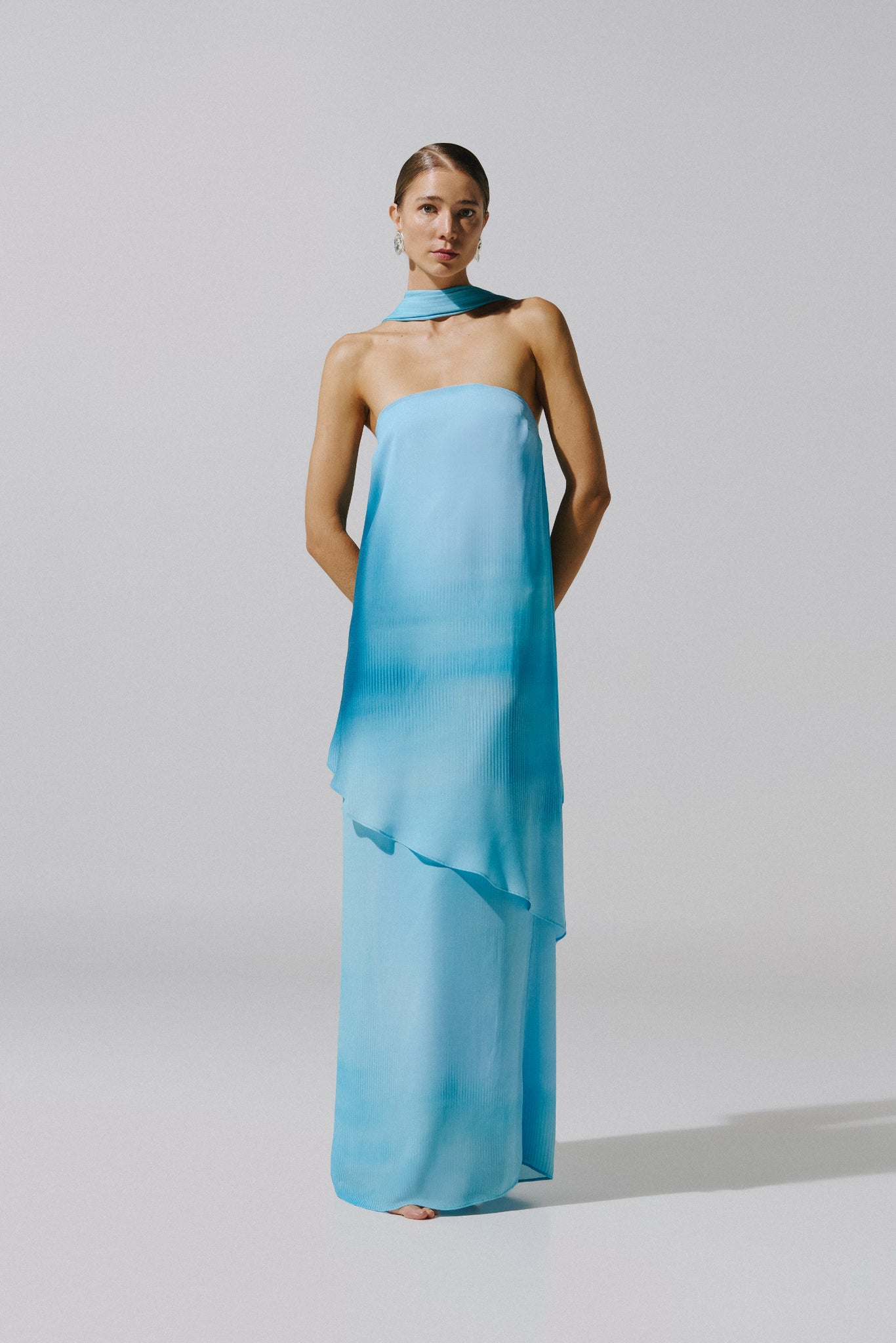 Presentamos el "El Maxi Dress" en Blue Cascade – un vestido strapless de doble capa con detalle de banda en el cuello. Diseñado con pinzas en la parte superior, elástico integrado y varillas laterales para mayor soporte. Terminado con abertura y cremallera posterior. Totalmente forrado para mayor cobertura.