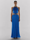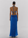 Introducing the "Lexi Maxi Dress" in Zircone Blue – a halter-neck silhouette with an open back and side cut-outs. Features a Baobab-shaped embellishment, back darts, and zipper closure. Crafted in textured fabric with full lining and a maxi length.