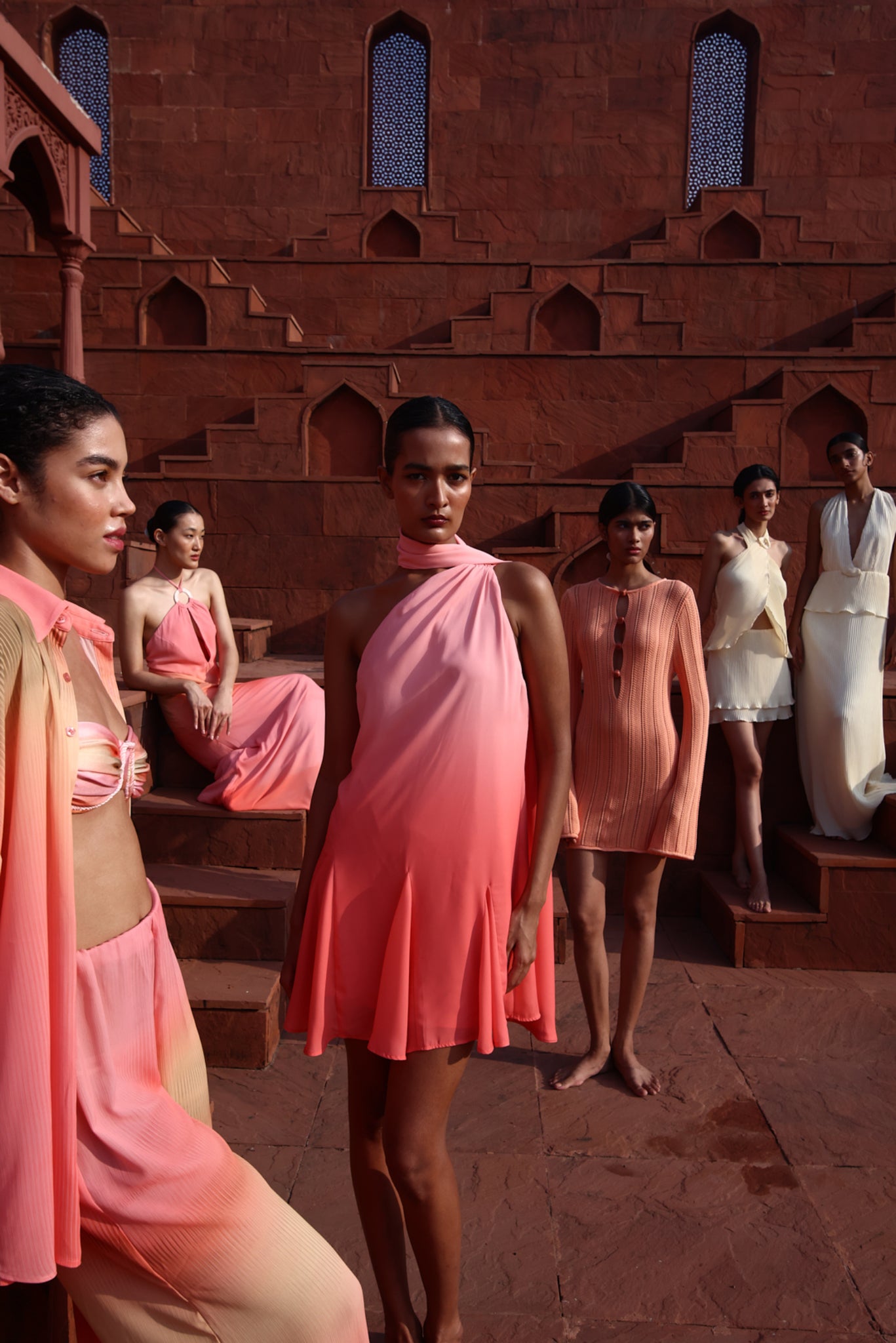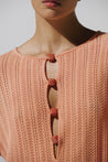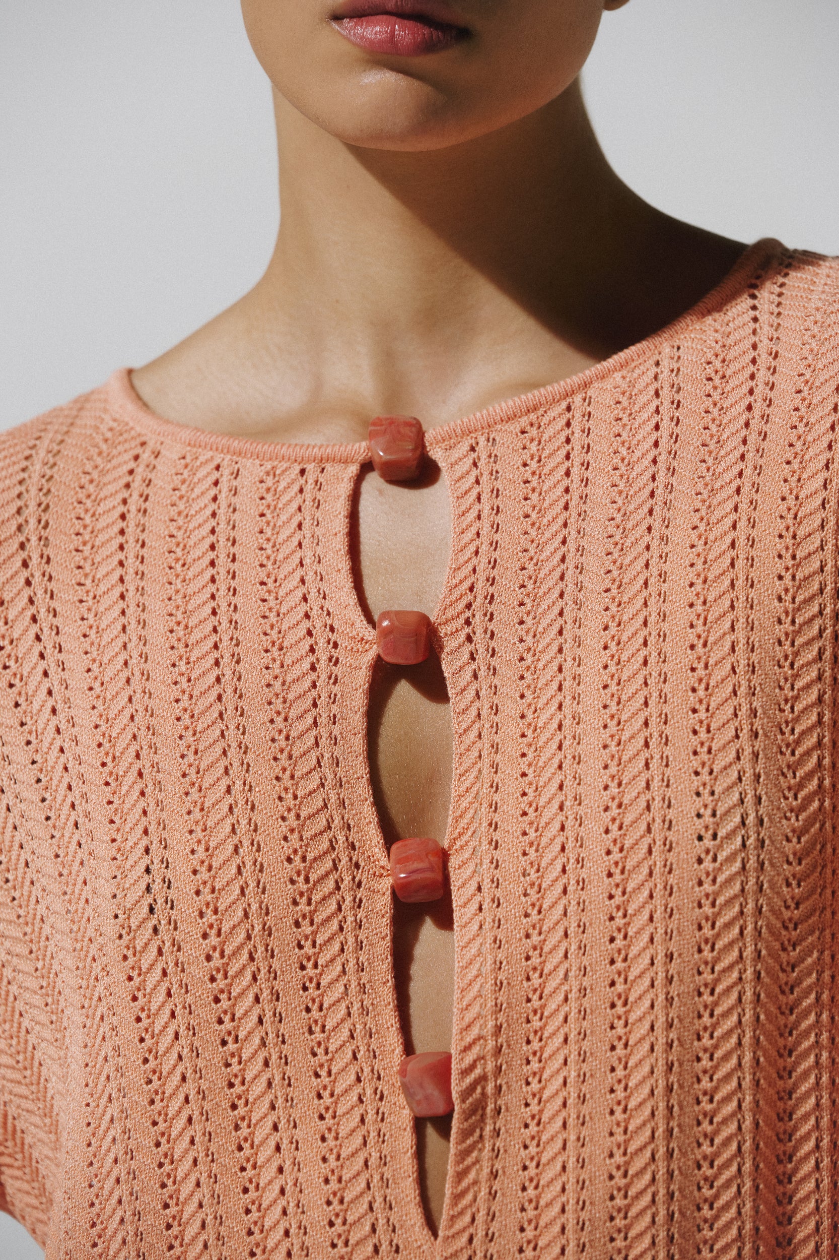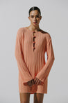 Presentamos el "Mamu Mini Dress" en Peach – un diseño de cuello redondo con mangas largas, adornado con piedras de resina. Con recortes frontales en tela de punto semitransparente, sin forro y de largo mini.