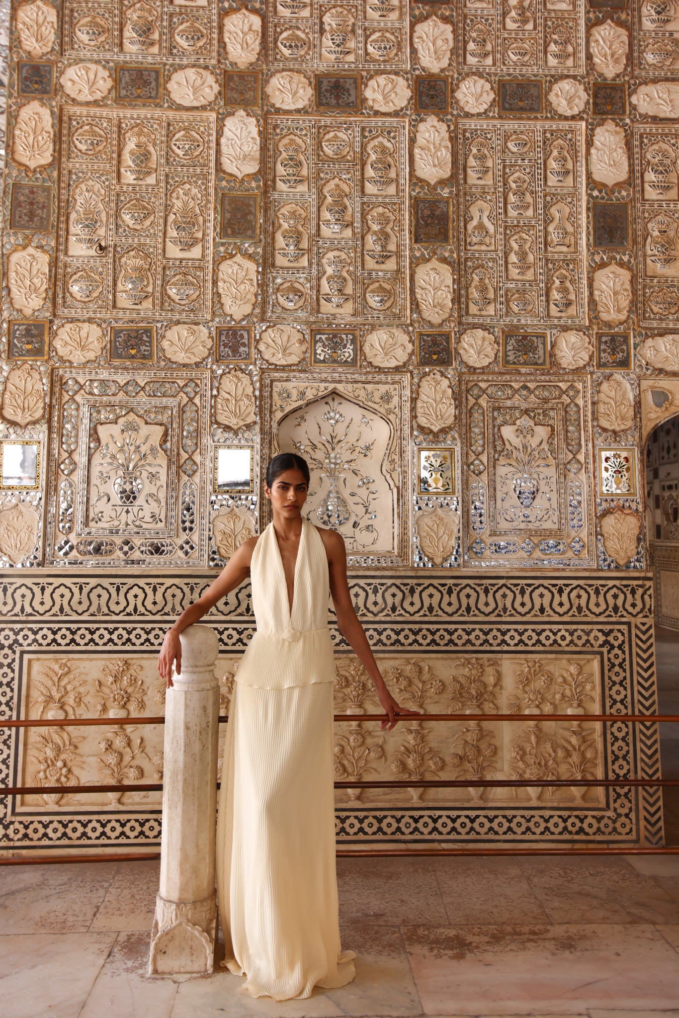 Presentamos el "Merida Maxi Dress" en Butter Yellow – un diseño de escote en V con espalda descubierta y tiras para amarrar. Con efecto de doble capa y herraje Baobab al frente. En tela plisada con pinzas delanteras y traseras, elástico superior para mejor ajuste, cierre con cremallera en la parte trasera, completamente forrado y de largo maxi.