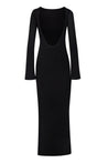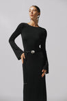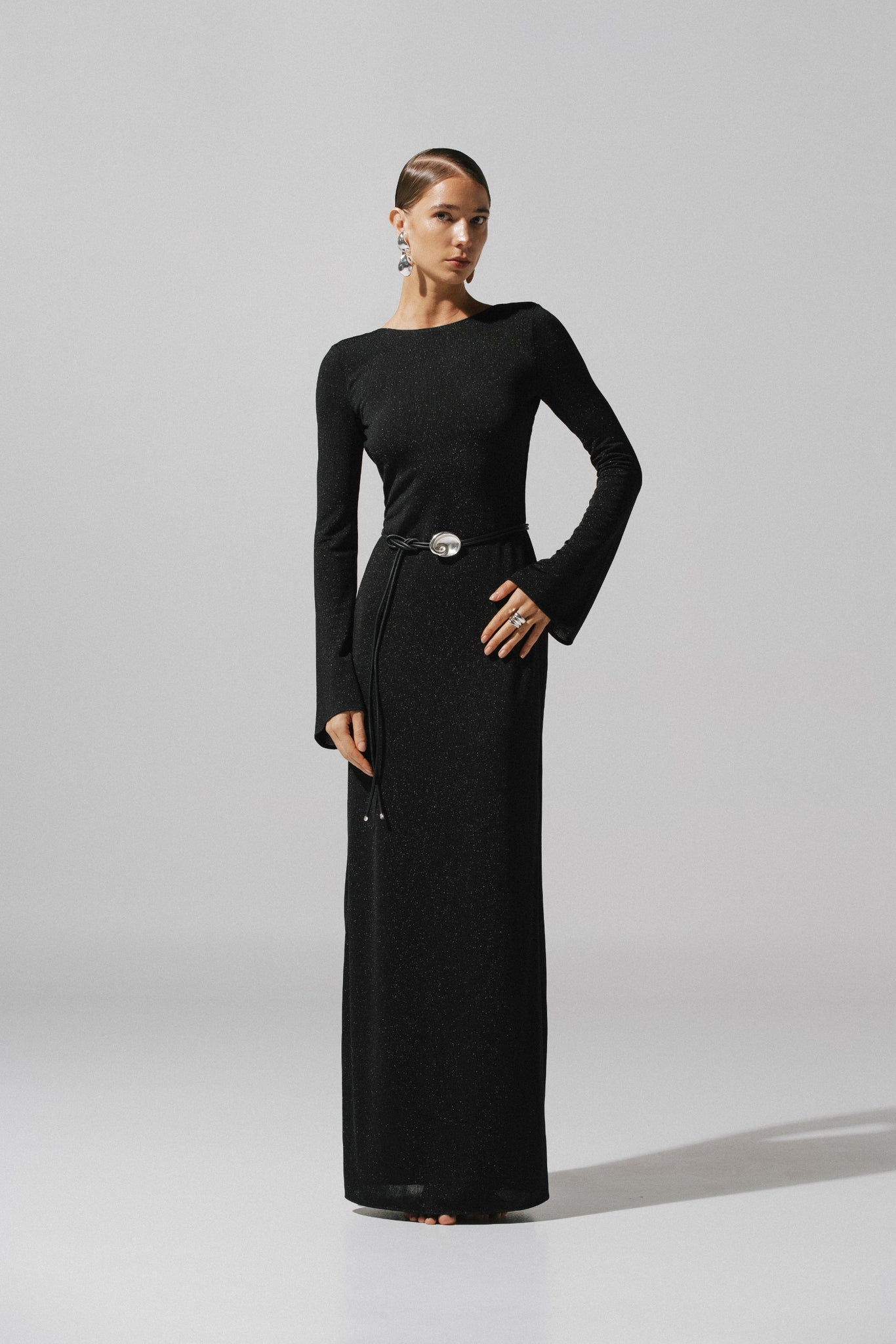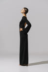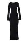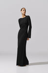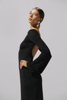 Presentamos el "Musa Maxi Dress" en Black – un diseño de cuello redondo con mangas largas y espalda descubierta. En tela de acabado brillante, completamente forrado y de largo maxi.