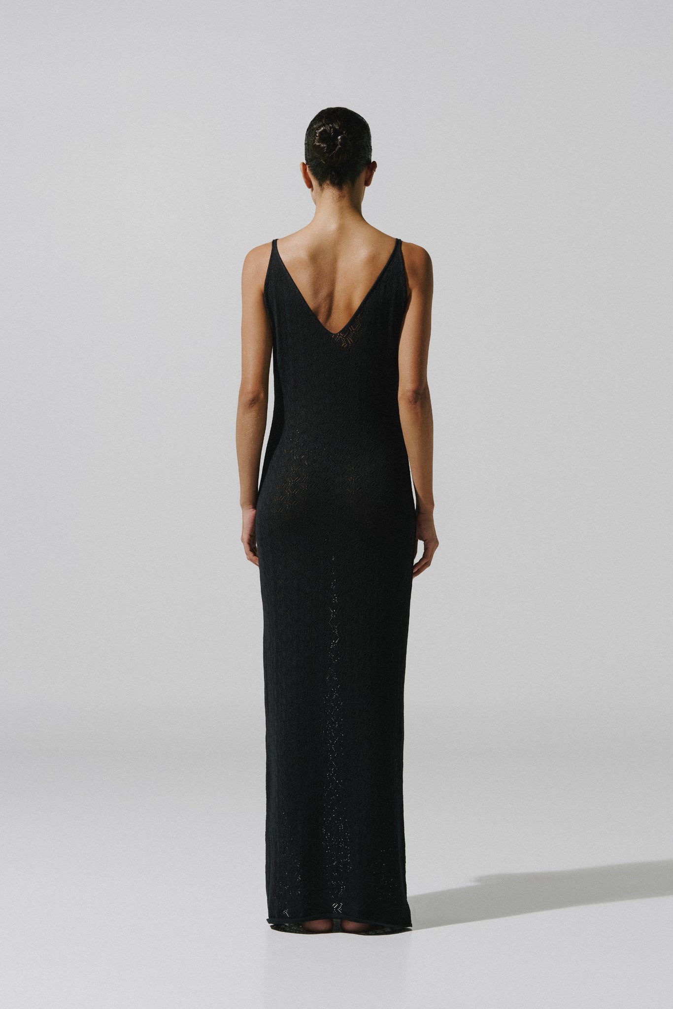 Presentamos el "Tamara Maxi Dress" en Black – un diseño de escote en V con detalle de argolla al frente. Elaborado en tejido de punto sin forro que revela una textura sutil, con silueta fluida y largo maxi.