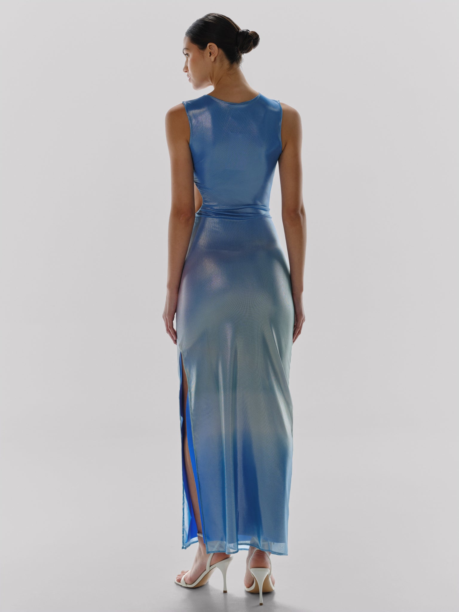 Vestido maxi fruncido, de tela metálica de tres tonos, silueta favorecedora y los encantadores detalles de recortes combinan para elevar el look.