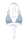 Presentamos el "Kaia Bikini Top" en Grey Blue – un diseño triangular con tiras ajustables para amarrar y detalle de argolla al frente. En tela texturizada, sin varillas ni copas, completamente forrado para un ajuste cĂłmodo y natural. CombĂnalo con el bottom compañero para un look coordinado.