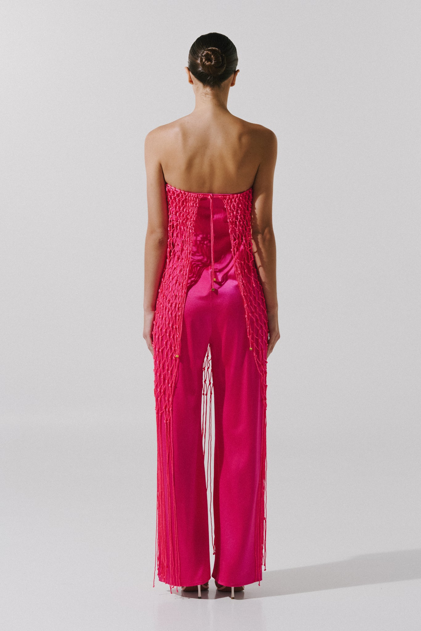 Introducing the ethereal "Indira Jumpsuit" in Granada – A strapless jumpsuit adorned with intricate net detailing, woven from the threads of a sustainable fabric that finds its origin in the depths of the ocean's embrace. The "Indira Jumpsuit" is a masterpiece of fashion, a symphony of elegance and charm. What makes it truly remarkable is that the fabric itself is a testament to our commitment to sustainability.
