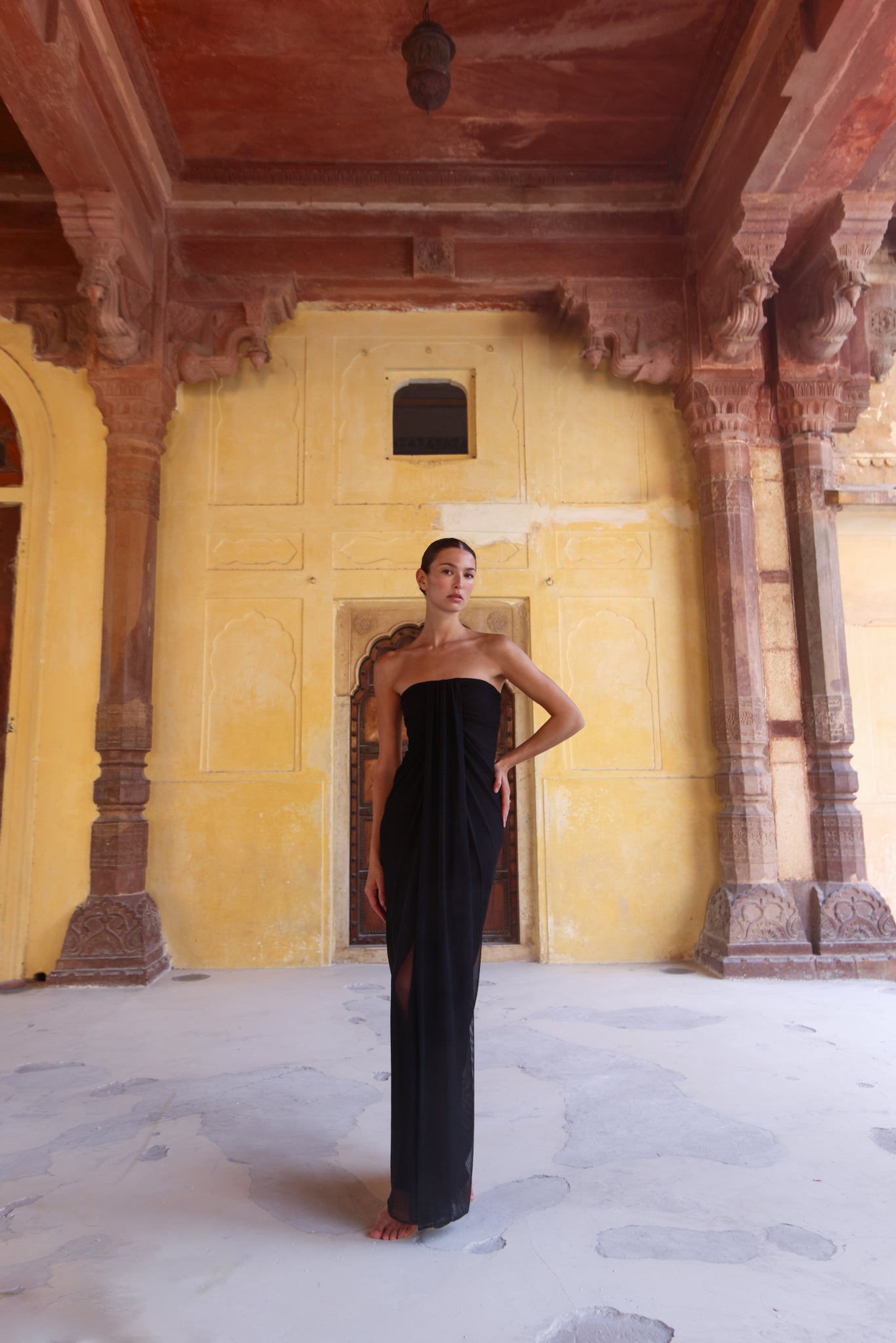 Presentamos el "Lena Maxi Dress" en Black – un diseño strapless con detalle en cascada y fruncido que resalta la silueta. En malla con abertura frontal, elástico superior para mejor ajuste, completamente forrado y de largo maxi.