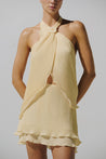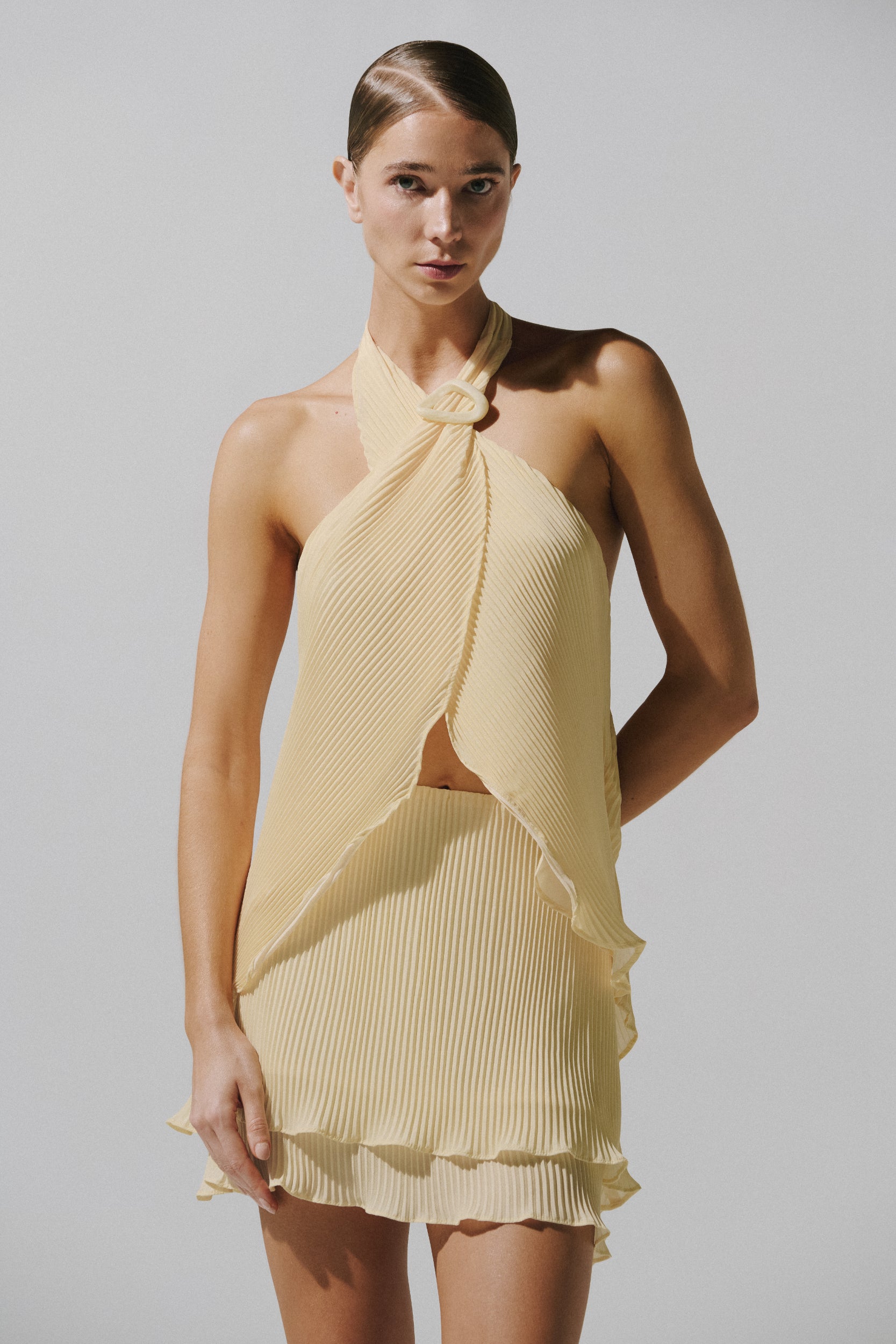 Presentamos la "Lira Mini Skirt" en Butter Yellow – una falda de tiro alto con efecto de doble capa y cierre con cremallera en la parte trasera. En tela plisada, completamente forrada y de largo mini. Combínala con el top compañero para un look coordinado.