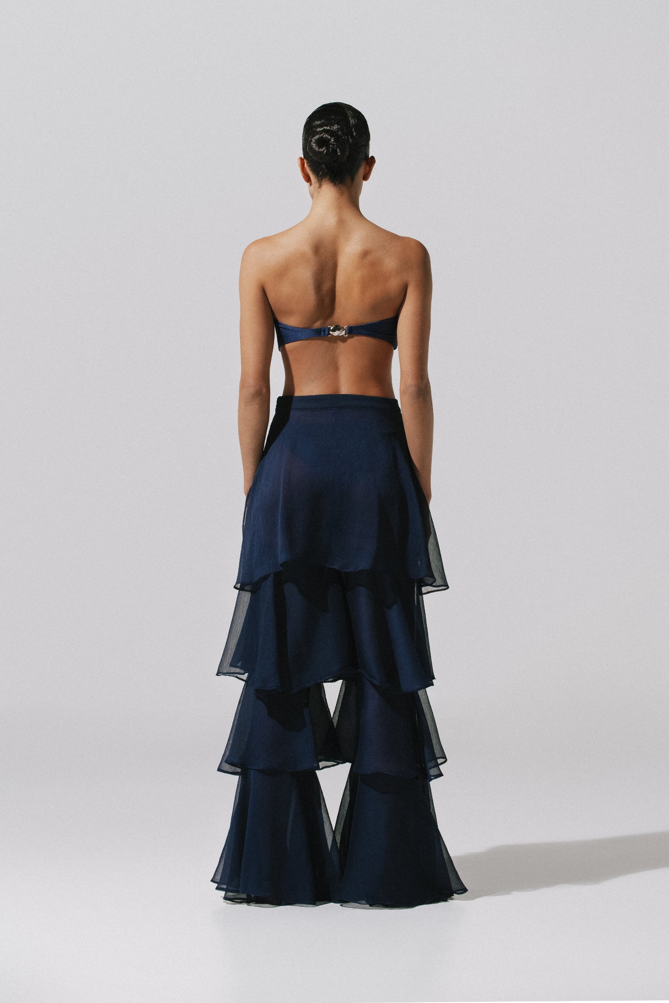 Presentamos el "Malka Pants" en Night Blue – un diseño de silueta wide leg con boleros y cintura reforzada. Con cierre de cremallera lateral, en tejido semitransparente y sin forro. Úsalo con el top compañero para un look coordinado.