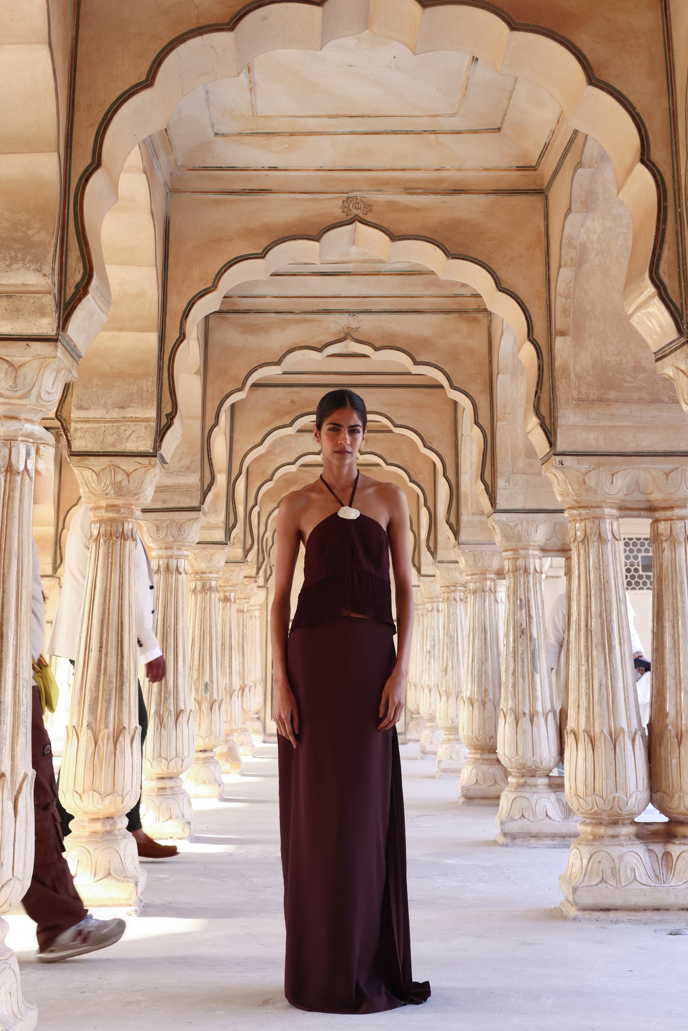 Presentamos la "Calao Skirt" en Chocolate – una falda de tiro alto con detalle plisado y godets que aportan movimiento. Con pinzas en la parte trasera, cierre con cremallera, completamente forrada y de largo maxi. Combínala con el top compañero para un look coordinado.