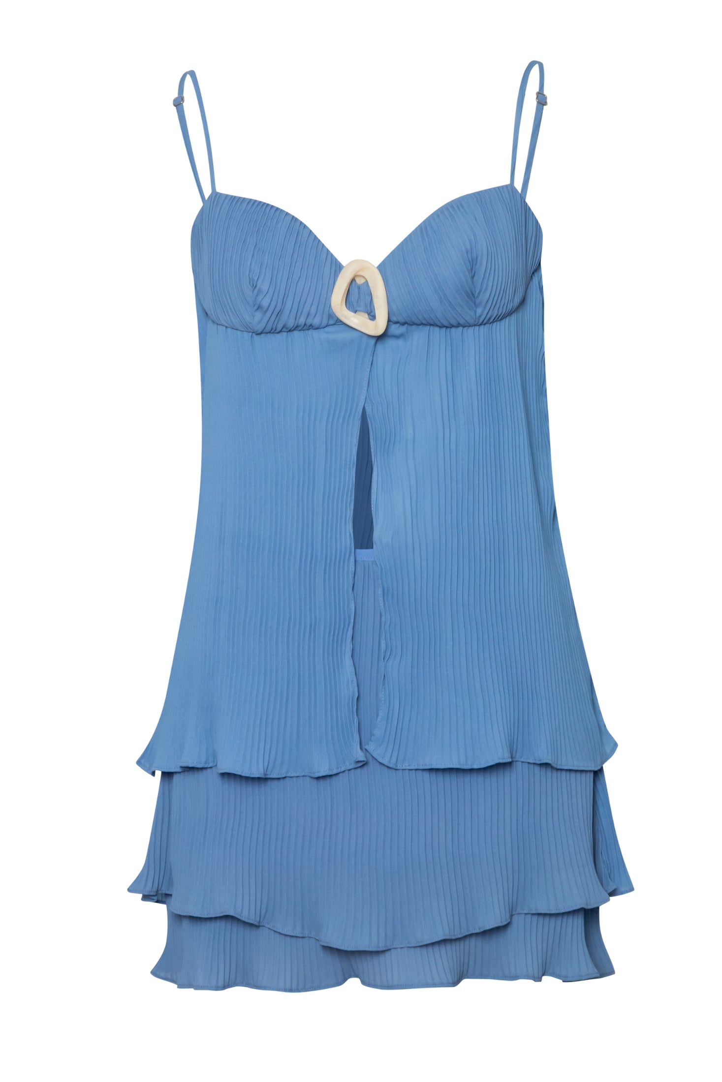 Presentamos la "Lima Mini Skirt" en Ibiza Blue – una falda de tiro alto con efecto de doble capa y cierre con cremallera en la parte trasera. En tela plisada, completamente forrada y de largo mini. Combínala con el top compañero para un look coordinado.
