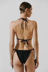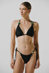 Introducing the "Kaia Bikini Bottom" in Black – a high-cut bikini bottom with self-tie straps and adjustable coverage. Featuring ruched detailing and embellishments, it is fully lined for comfort. Pair with the matching Kaia Bikini Top for a complete look.