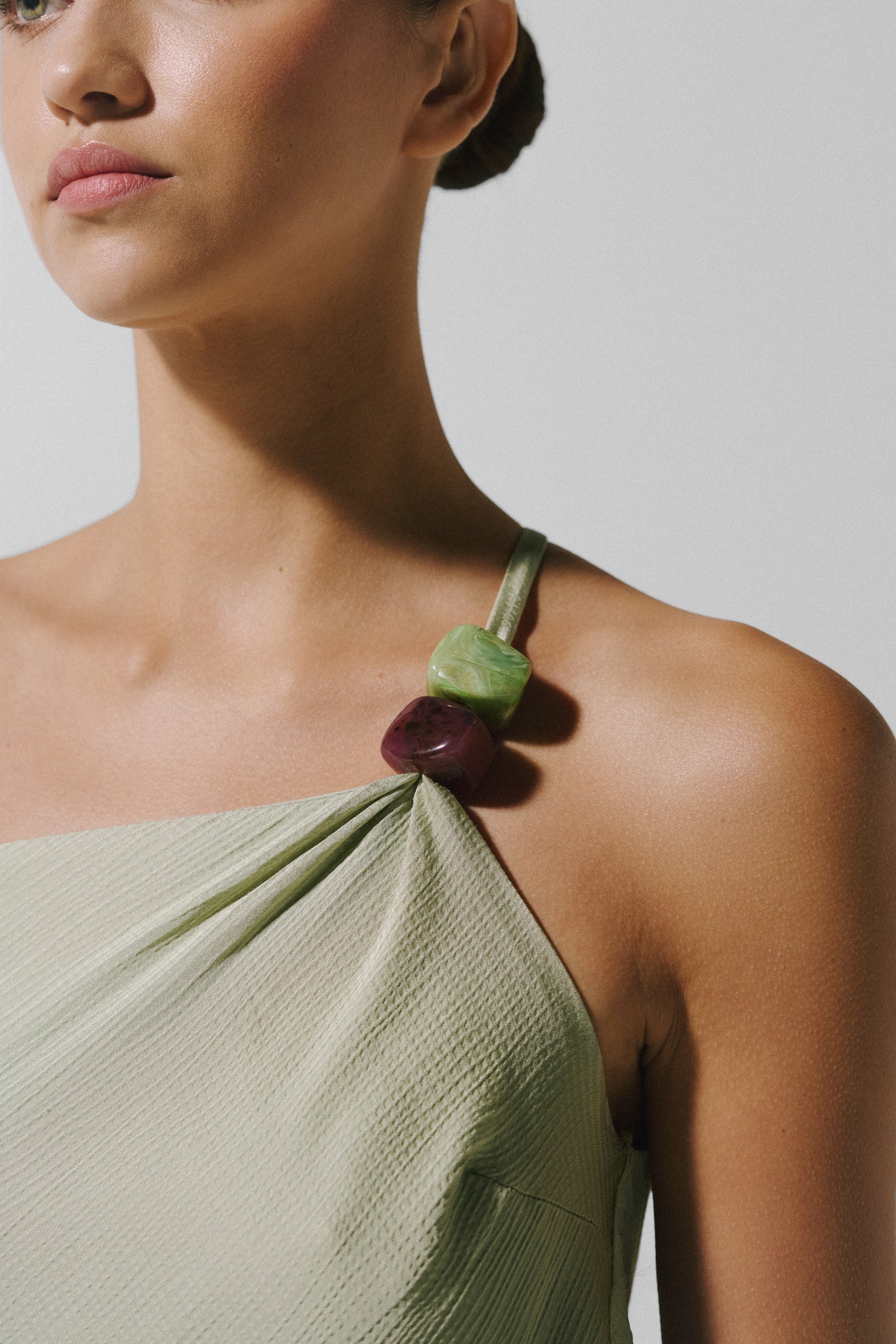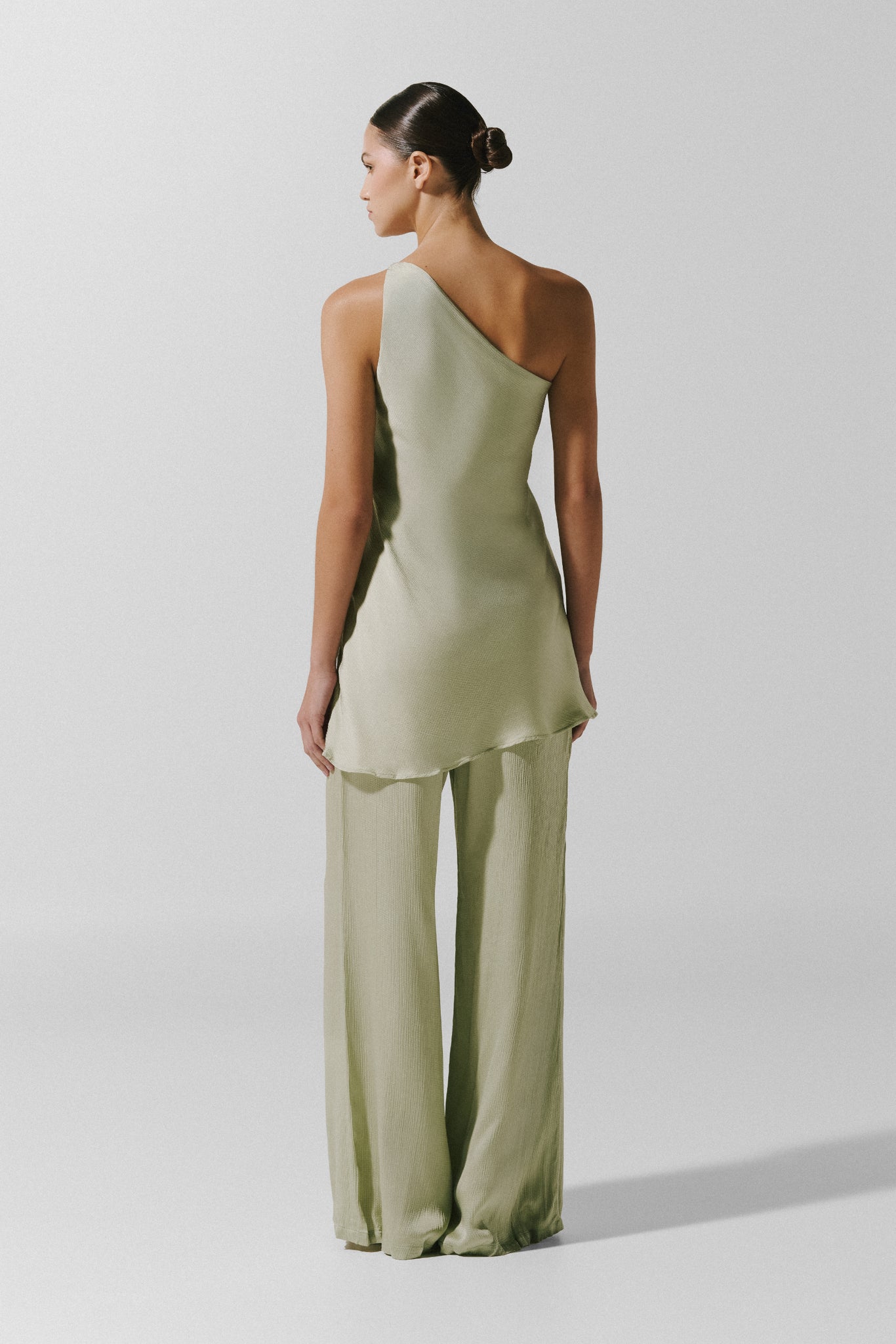 Introducing the "Ferrat Top" in Matcha – a one-shoulder top featuring delicate embellishments for a distinctive touch. Fully lined for coverage and comfort. Pair with the matching Ferrat Pants for a coordinated look.
