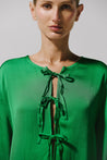 Introducing the "Parma Blouse" in Emerald Green – a V-neckline top featuring front slit openings with adjustable ties. Designed with long sleeves and crafted in textured fabric. Unlined for a lightweight feel.