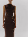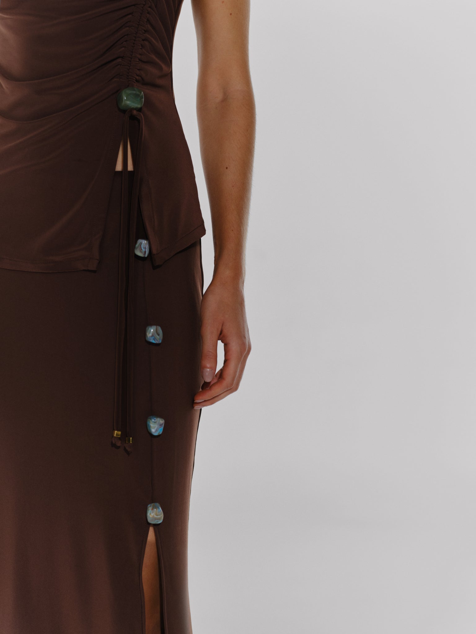 Introducing the "Uli Top" in Cocoa – a ruched silhouette with a round neckline and side opening. Accented with embellished detailing and partially lined for a sleek finish. Pair it with the matching skirt for a coordinated look.