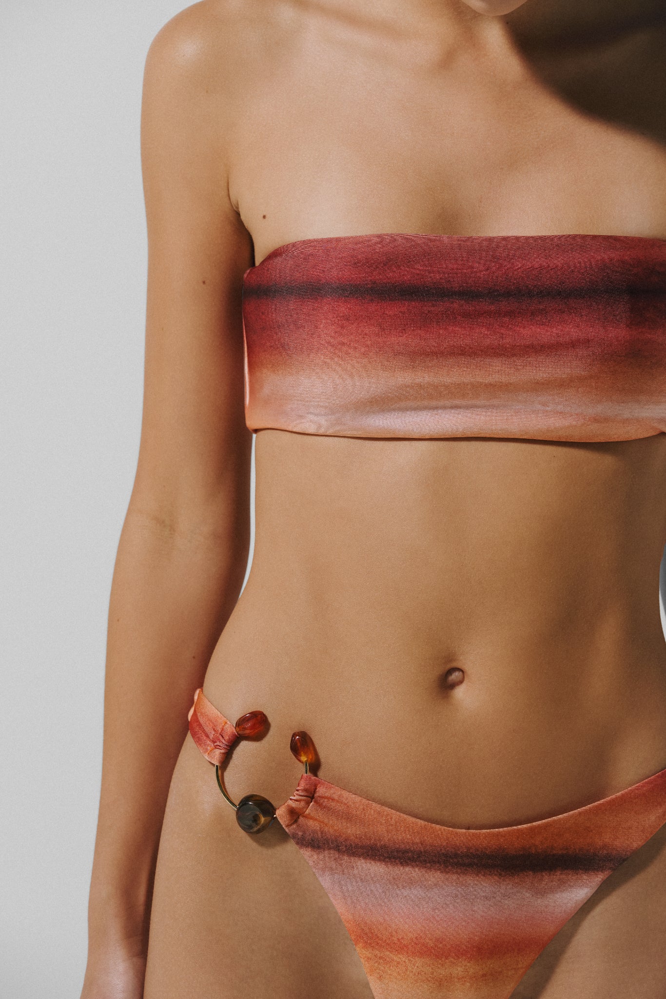 Presentamos el “Galo Bikini Top” en Tierra Inca – un diseño strapless, sin copas y con varillas laterales para mayor soporte y estructura. Con forro para un ajuste cómodo. Combínalo con el bikini bottom a juego para un look coordinado.