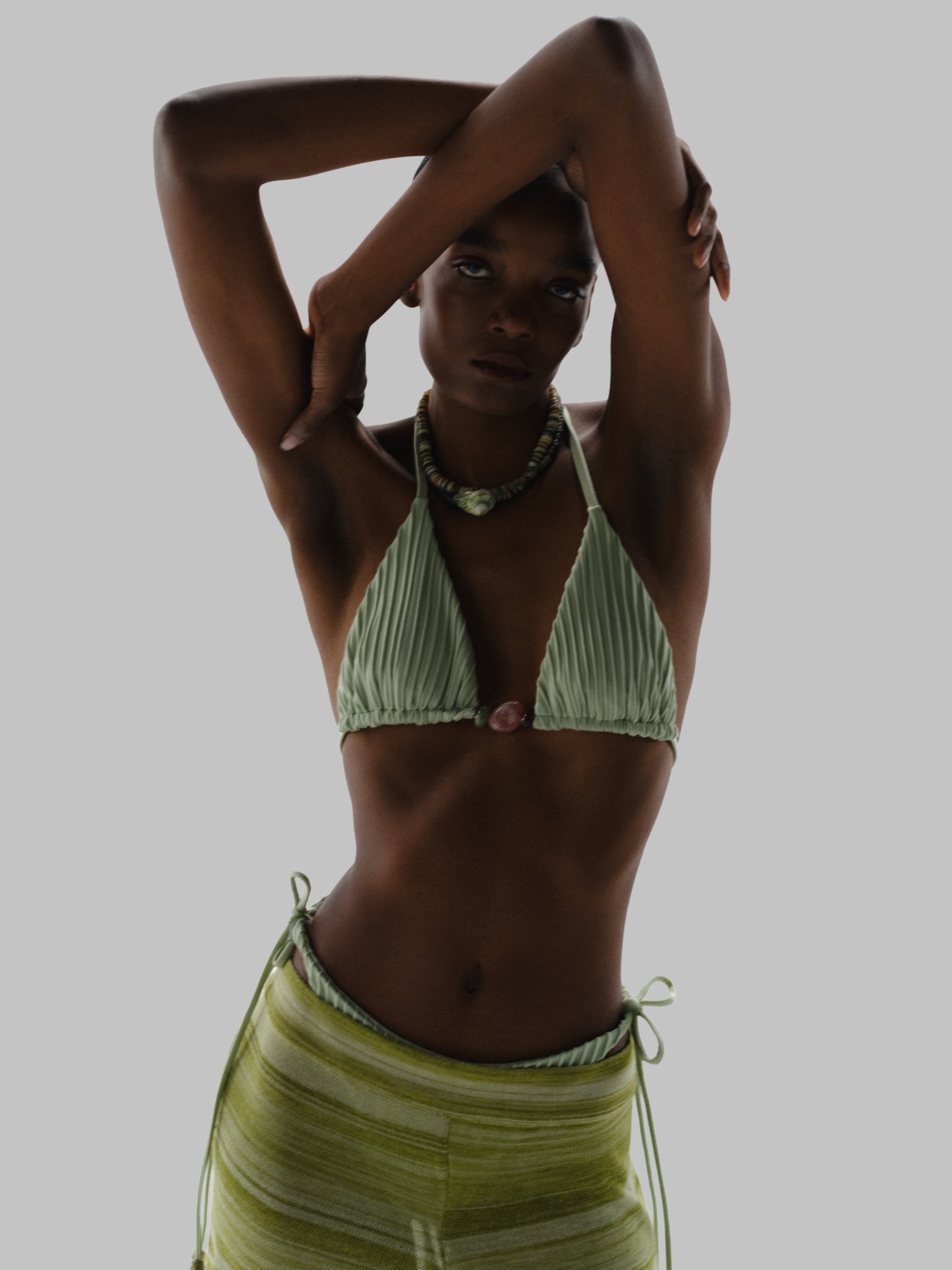 Presentamos el “Kaia Bikini Top” en Jade Andino – un diseño de top triangular pensado para un ajuste favorecedor y femenino. Con tiras de amarrar ajustables y adornado con piedras de resina que aportan un brillo sutil. Diseñado con copas y sin varillas para mayor comodidad. Confeccionado en tela texturizada y finalizado con forro para una sensación suave. Combínalo con el bottom a juego para un look coordinado.