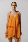 Introducing the "Marian Mini Dress" in Orange – a V-neckline design with a two-layered silhouette and asymmetric hemline. Features embellished and adjustable straps, top darts, and a side slit. Crafted in textured fabric and fully lined.Â