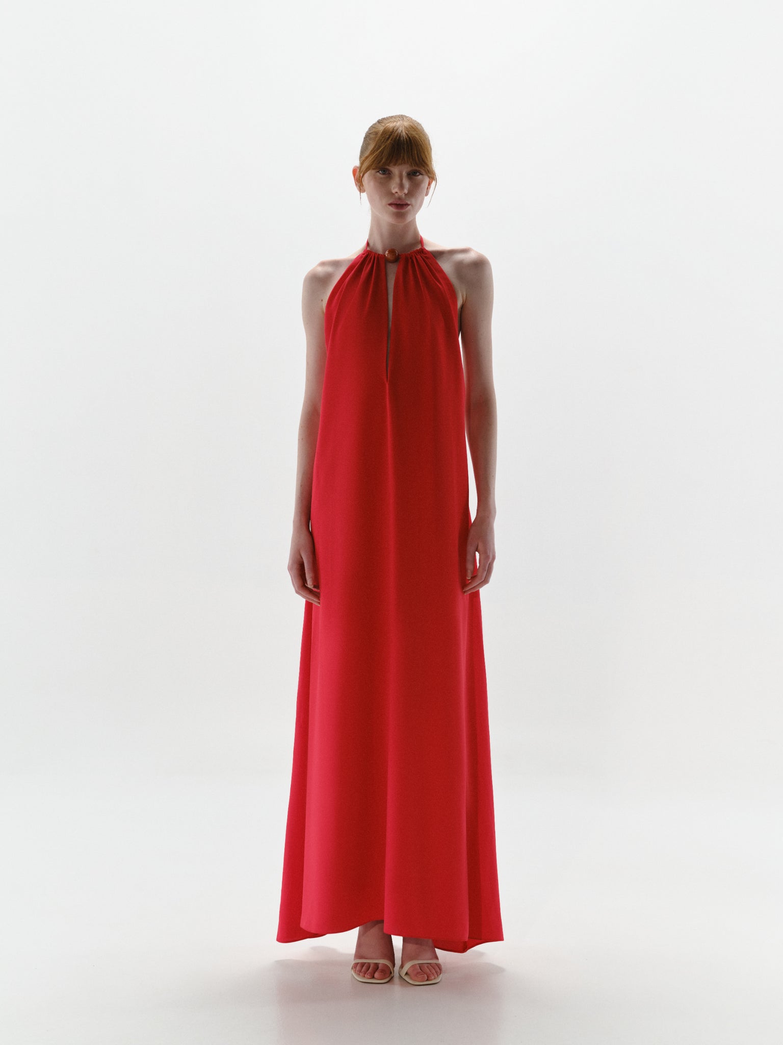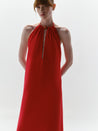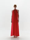Introducing the "Rondine Maxi Dress" in Carmine – a maxi dress with a halter neckline, open back, and front cutout. Designed with embellishments and silicone elastic grips at the sides for support. Fully lined for coverage.