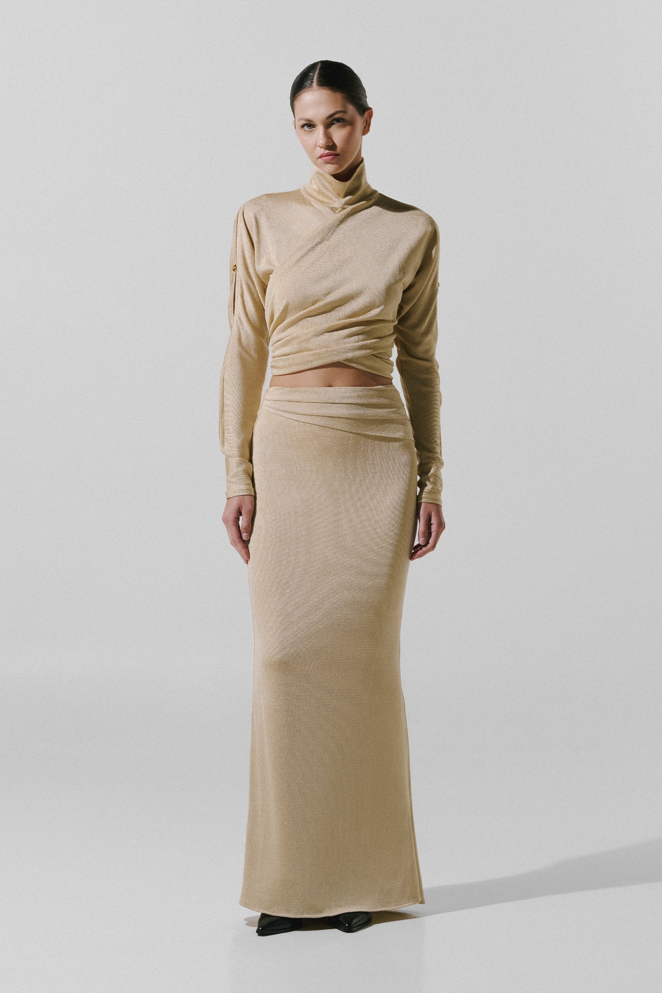 Introduciendo el "Blusa Amber" en Almendras – un llamativo top corto que combina la sofisticación moderna con un estilo único. Con escote alto y silueta ajustada, este diseño plisado está enriquecido con detalles en forma de Baobab y adornos fruncidos. Las mangas largas, detalladas con aberturas desde el puño hasta el codo, añaden un toque atrevido. Combínalo con la Falda Amber para una apariencia coordinada.