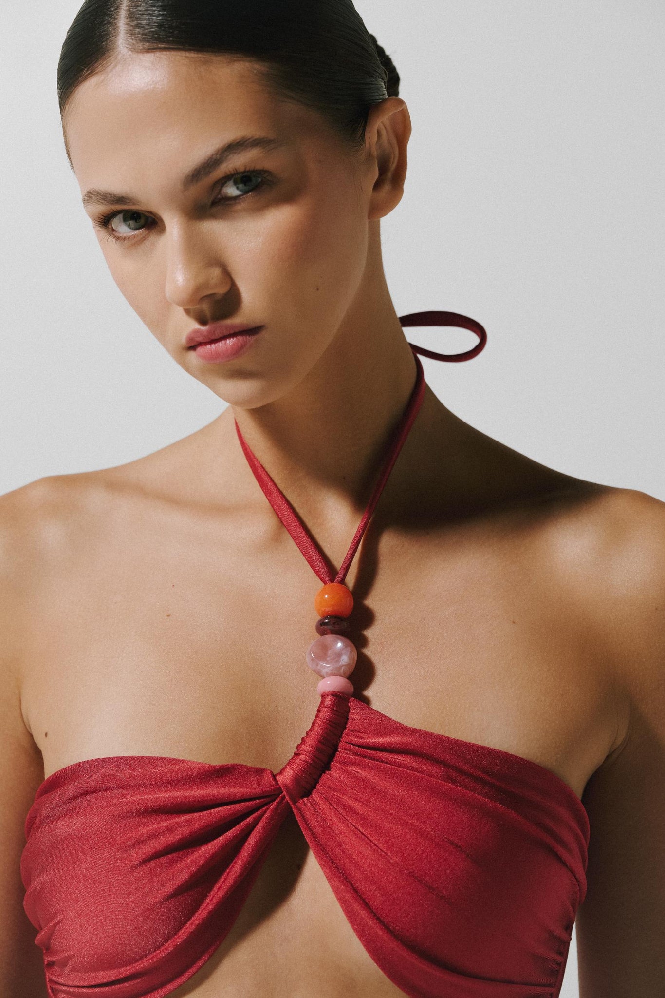 Presentamos el “Bari Bikini Top” en Arcilla – un diseño de cuello halter con tiras de amarrar y fruncido, adornado con piedras de resina. Cuenta con varillas laterales y elástico en la parte superior para mayor soporte, además de gancho trasero. Confeccionado en tela brillante y completamente forrado.