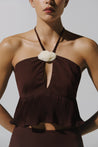 Presentamos el "Calao Top" en Chocolate – un diseño de cuello halter con espalda descubierta y tiras para amarrar. Con recortes frontales adornados con herraje Baobab y detalle plisado. Cierre con cremallera en la espalda, completamente forrado y silueta crop.