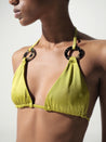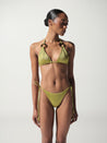 Presentamos el "Kaia Bikini Top" en Pistacho – un diseño triangular con tiras para amarrar y detalle de argolla al frente. Sin varillas ni copas, completamente forrado para un ajuste cĂłmodo y natural. CombĂnalo con el bottom compañero para un look coordinado.