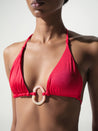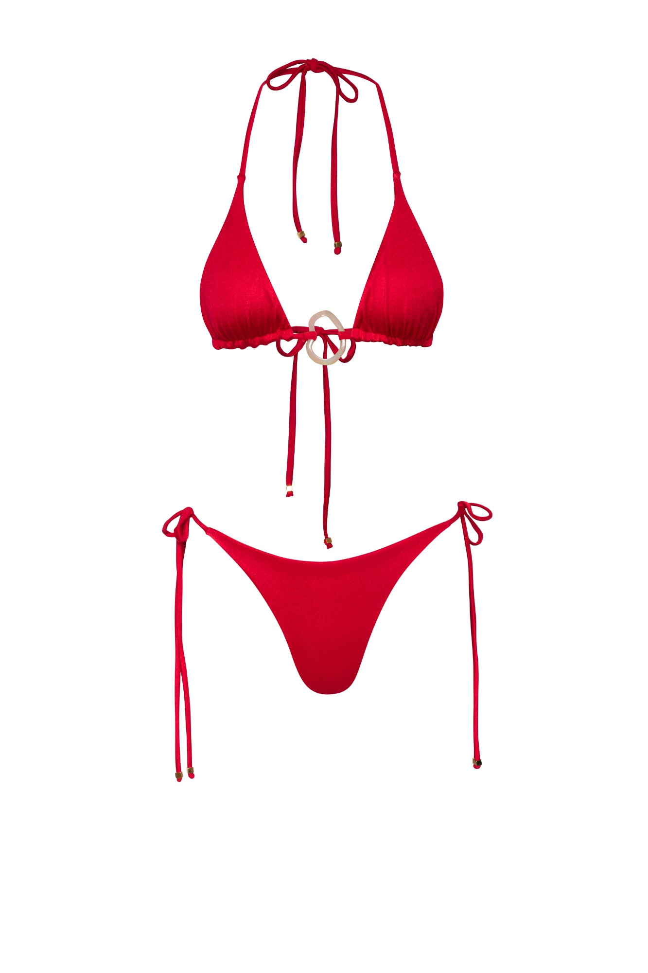 Presentamos el "Kaia Bikini Top" en Spicy Red – un diseño triangular con tiras para amarrar y herraje baobab. Sin varillas ni copas, completamente forrado para un ajuste cómodo y natural. Combínalo con el bottom compañero para un look coordinado.