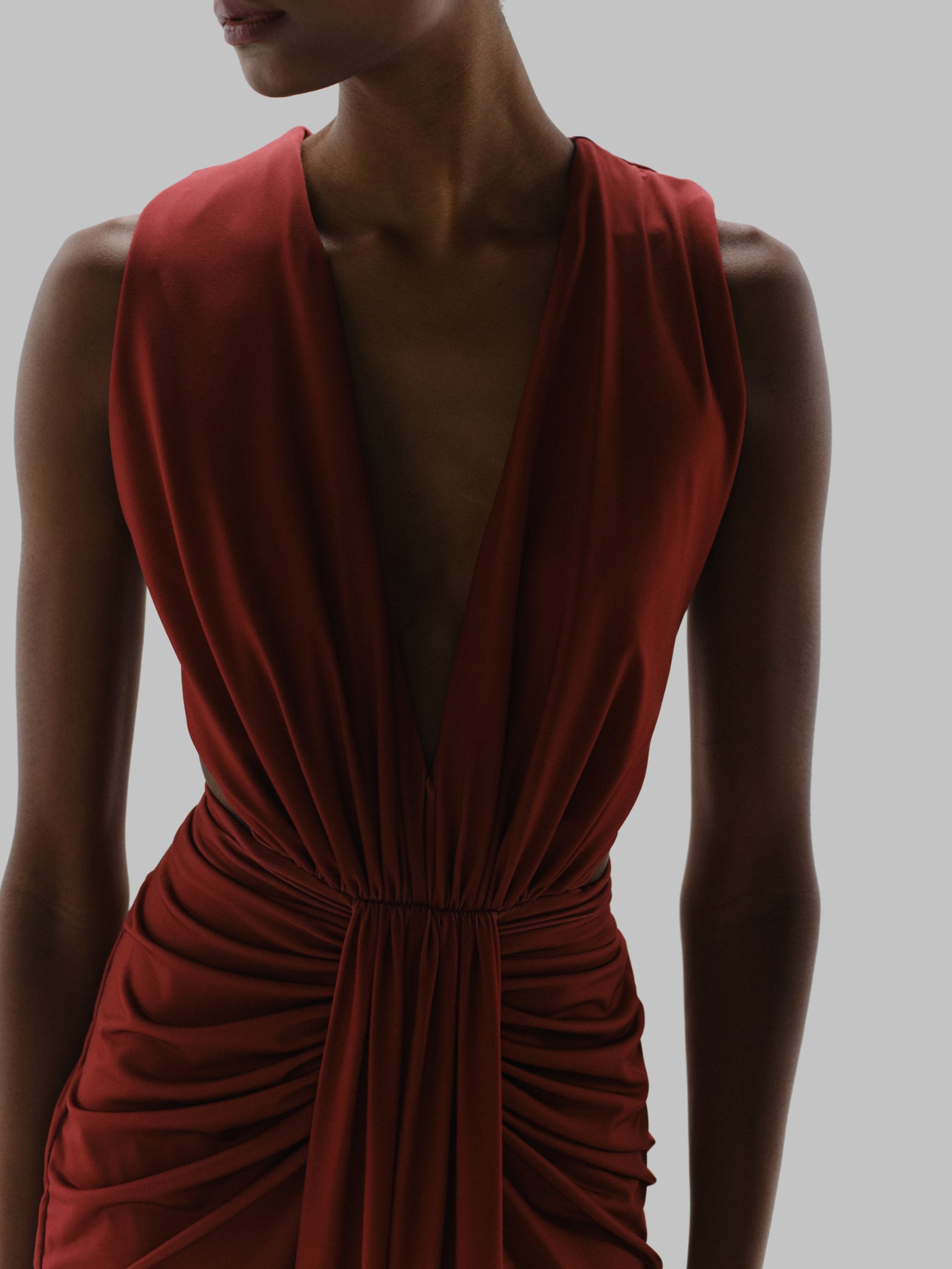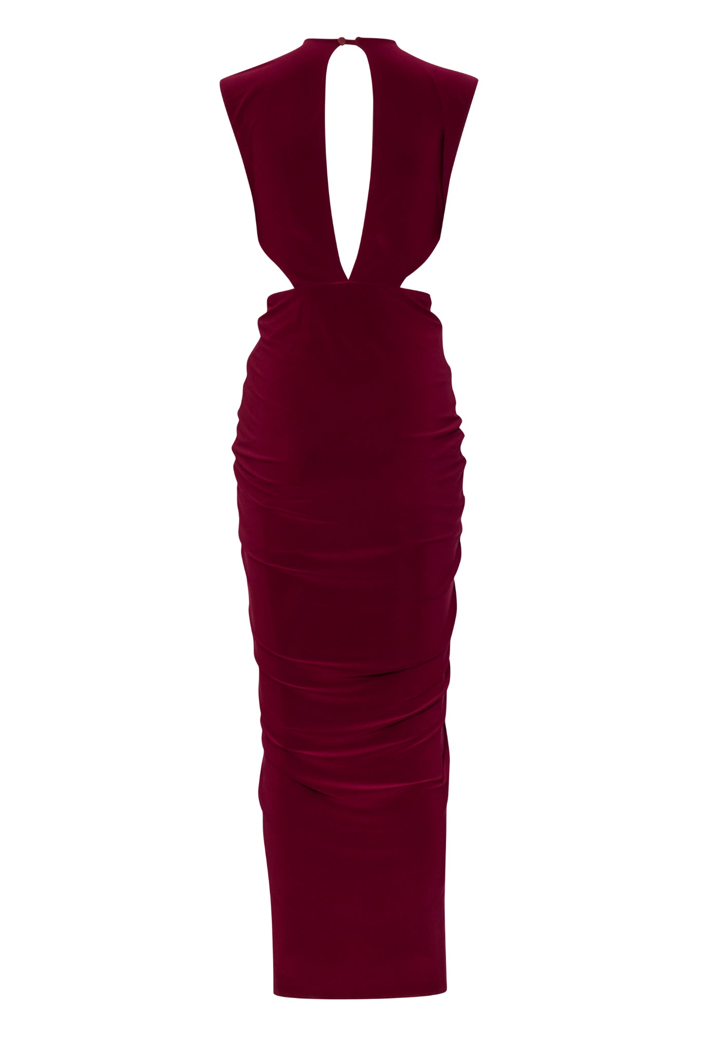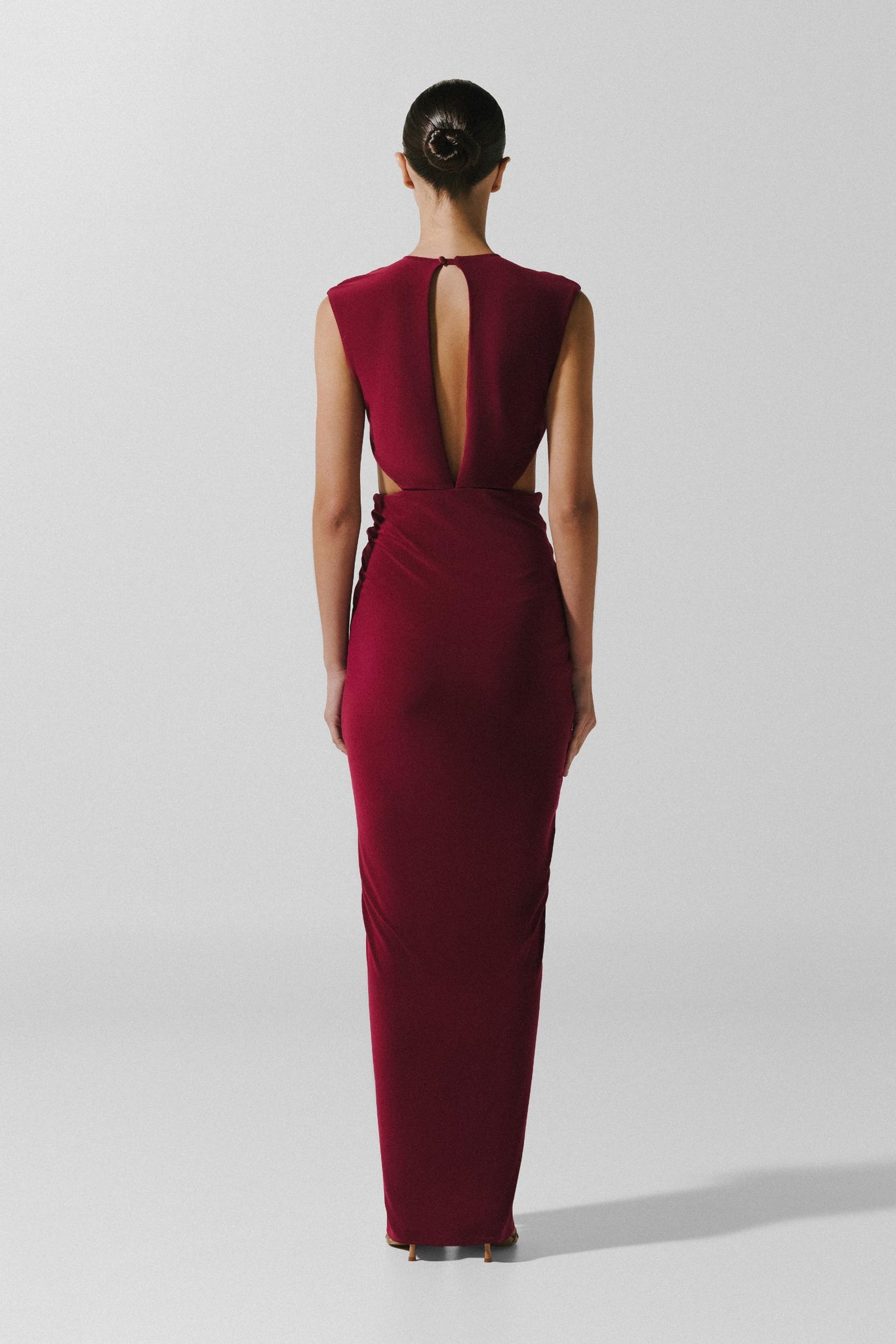 Presentamos el “Nia Maxi Dress” en Vino – un diseño con escote en V y detalle en cascada que aporta movimiento y sofisticación. Sus recortes laterales y fruncido realzan la silueta, mientras la cintura elástica brinda un ajuste cómodo. Cuenta con abertura frontal, está parcialmente forrado y presenta un largo maxi.