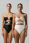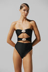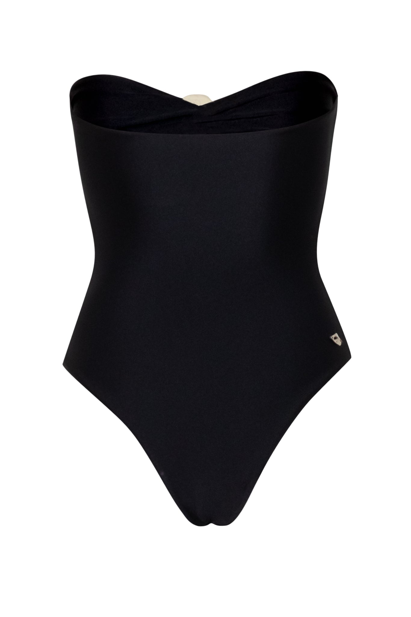 Presentamos el "Ola One Piece" en Black – un diseño strapless con escote corazón y recortes frontales adornados con herrajes Baobab. Con varillas laterales, sin copas y completamente forrado para un ajuste favorecedor y estructurado.