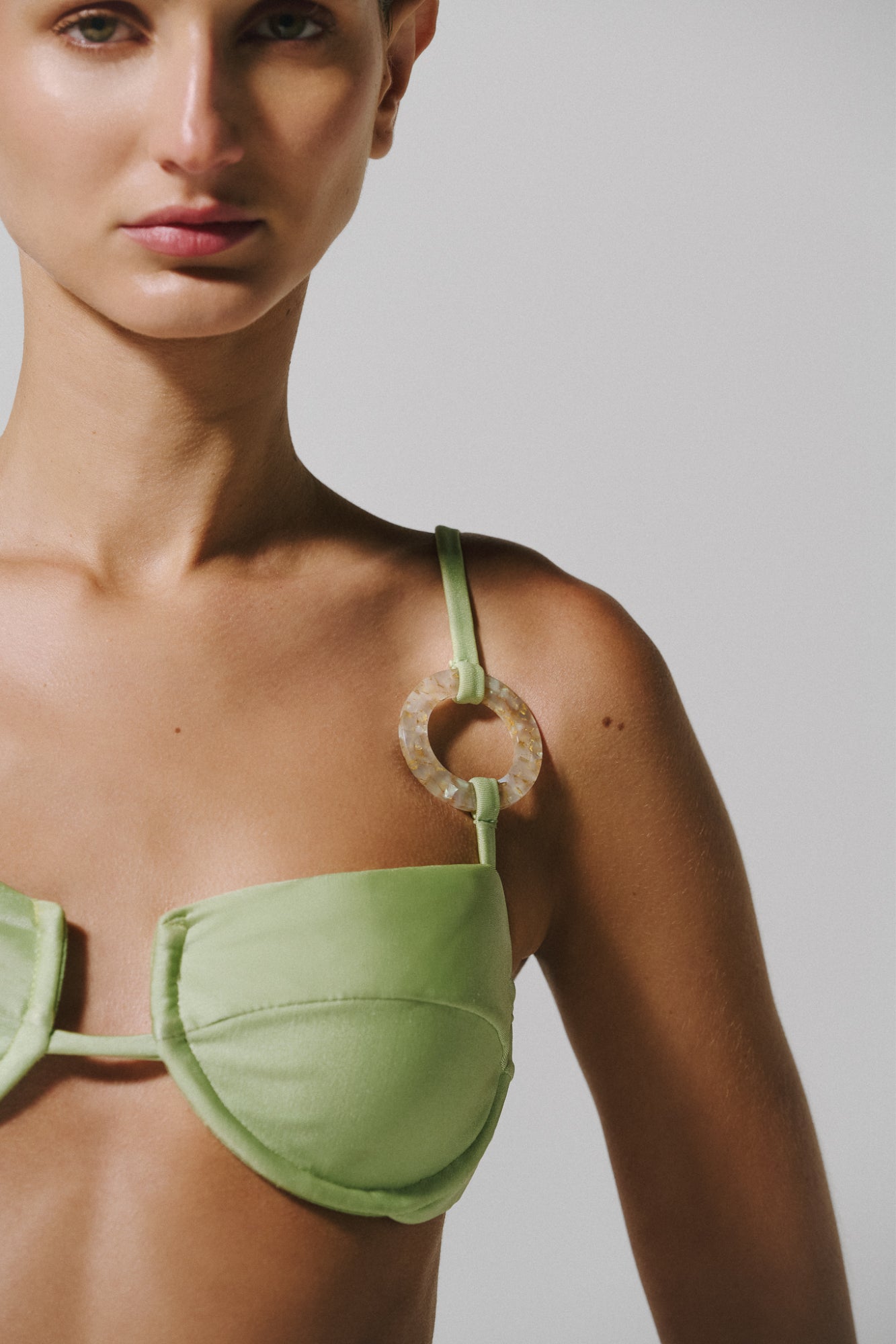 Presentamos el "Roma Bikini Top" en Sage – un diseño de escote balconette con tiras ajustables y varillas internas para soporte. En tela texturizada, sin copas y con cierre de gancho en la espalda. Completamente forrado. Combínalo con el bottom compañero para un look coordinado.