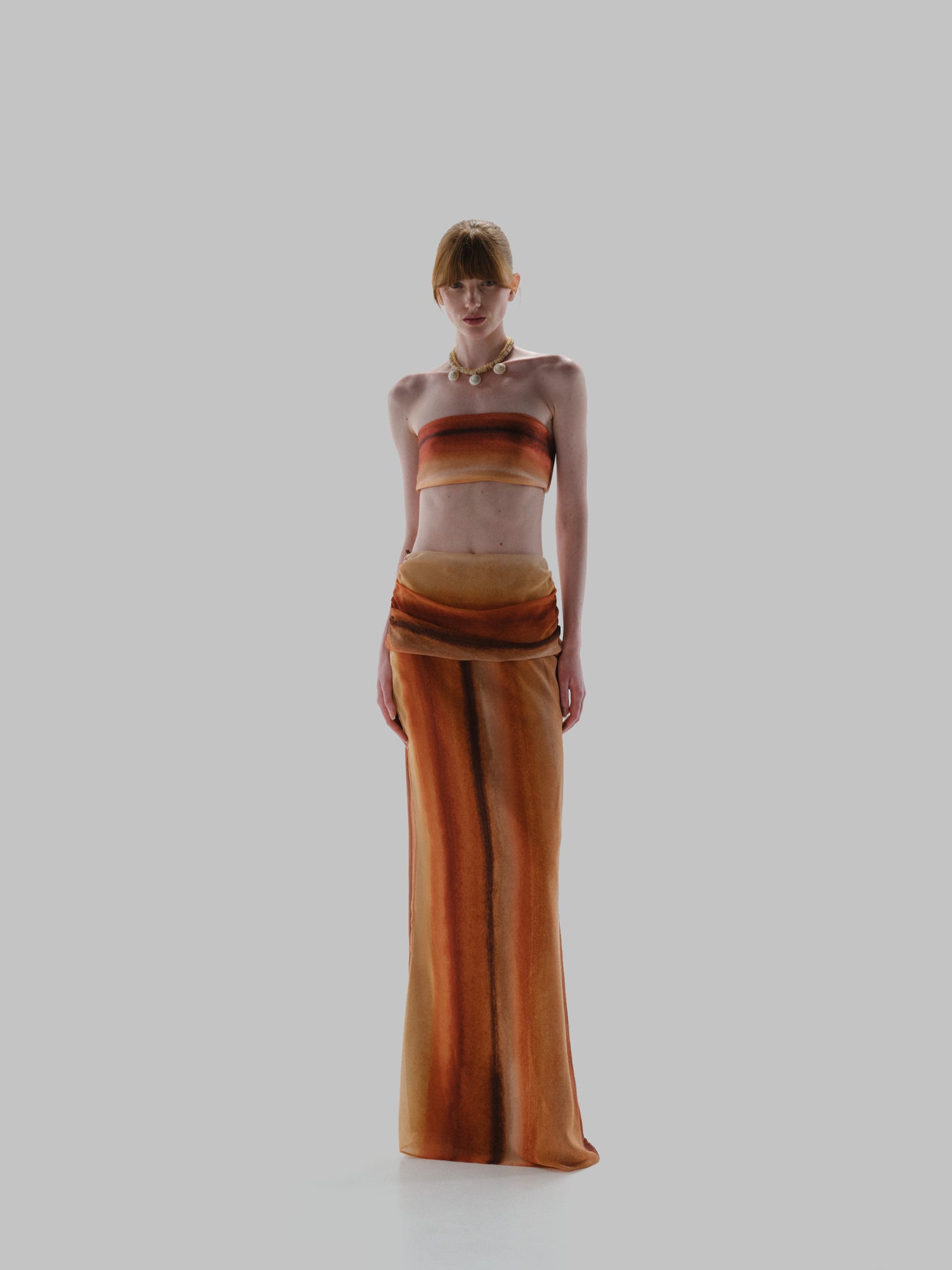 Presentamos el “Sumaq Maxi” en Tierra Inca – un diseño de tiro alto con delicado drapeado que realza la silueta. Incorpora pinzas en la espalda para un ajuste favorecedor y abertura trasera que aporta movimiento. Cuenta con cremallera trasera, está confeccionado en tejido semitransparente con forro y presenta un elegante largo maxi.