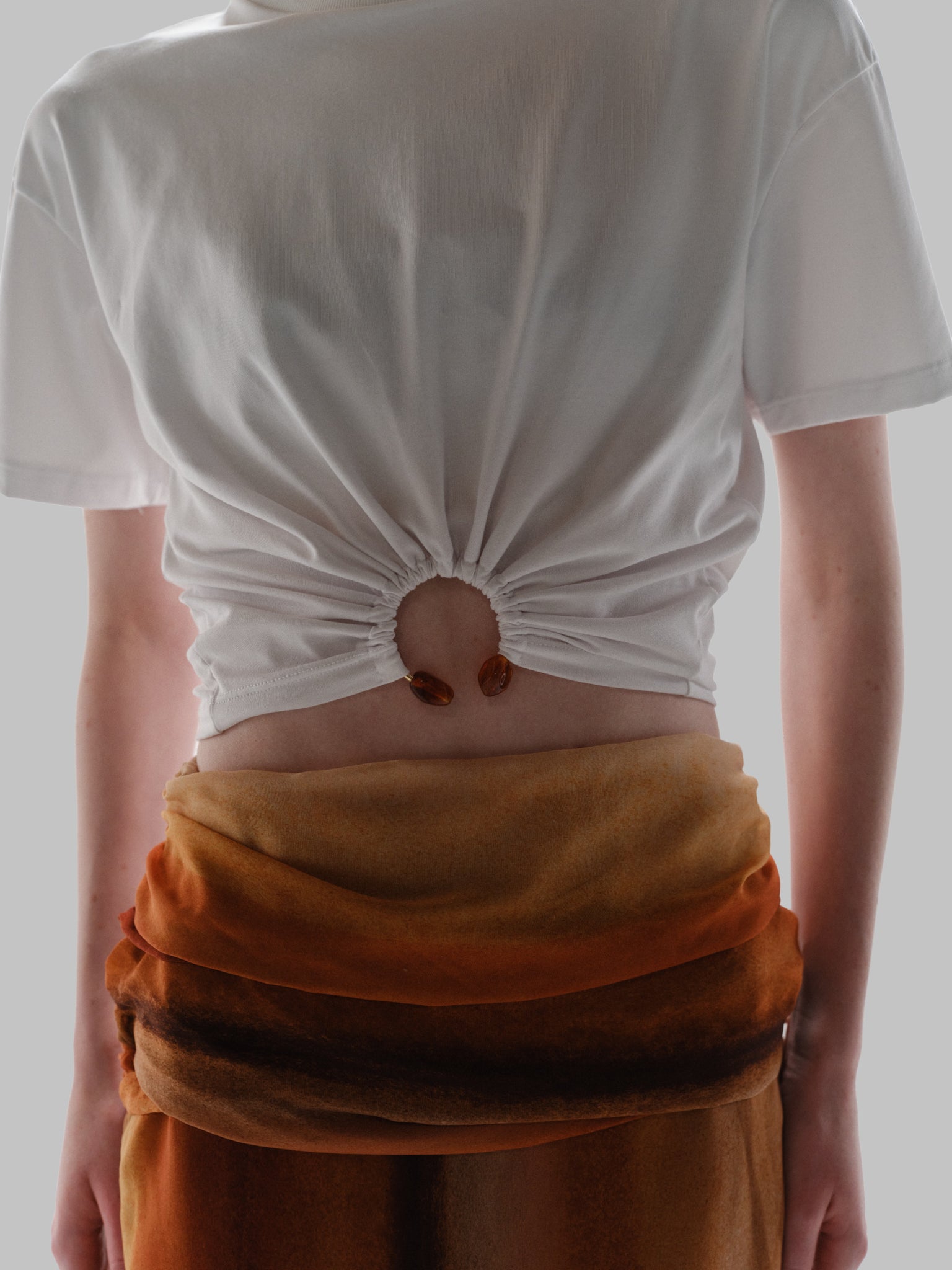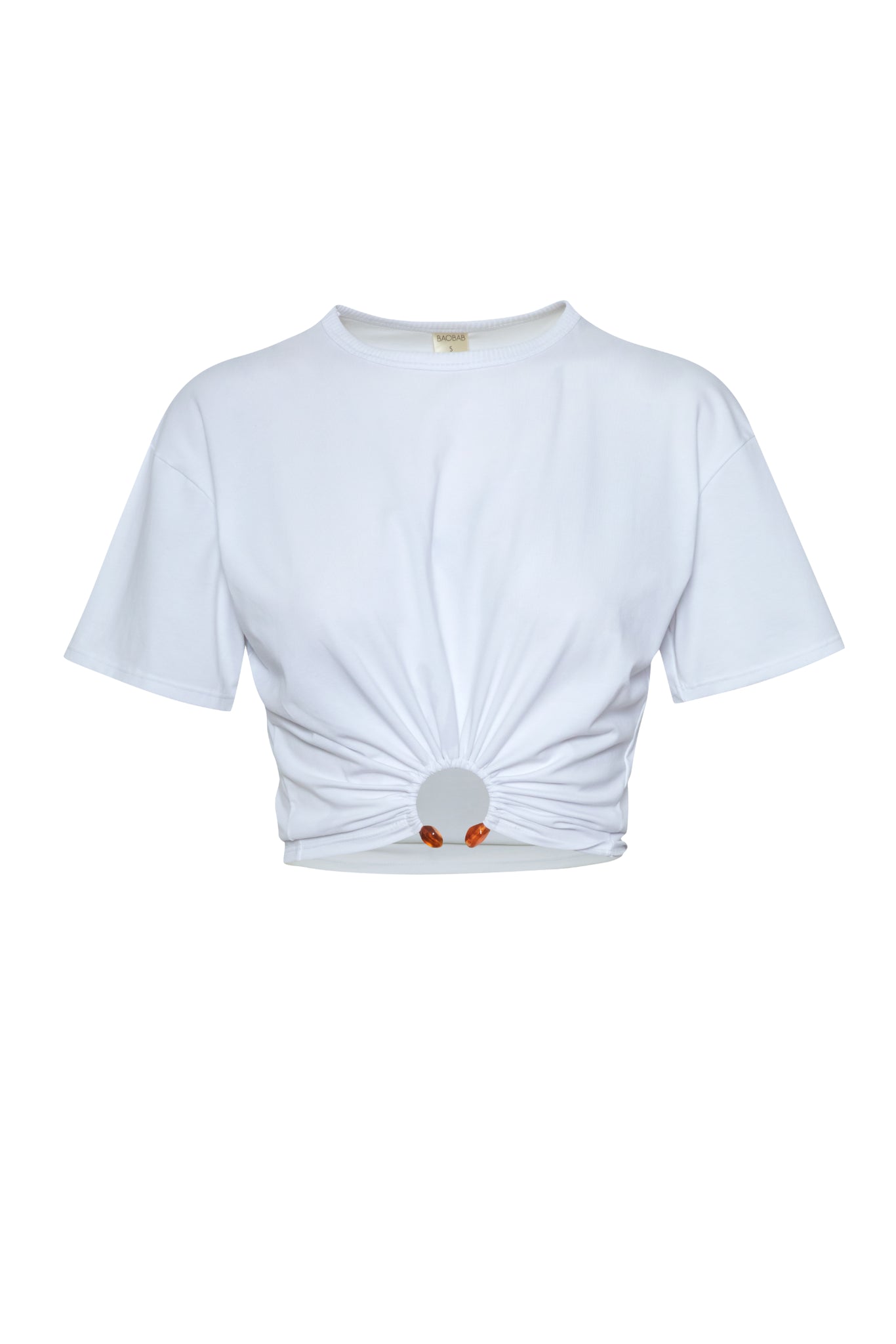Presentamos el “Tika T-Shirt” en Salina – un diseño de cuello redondo con fruncido que realza la silueta y detalle de argolla que aporta un toque distintivo. Sin forro y con largo crop para un look moderno y versátil.